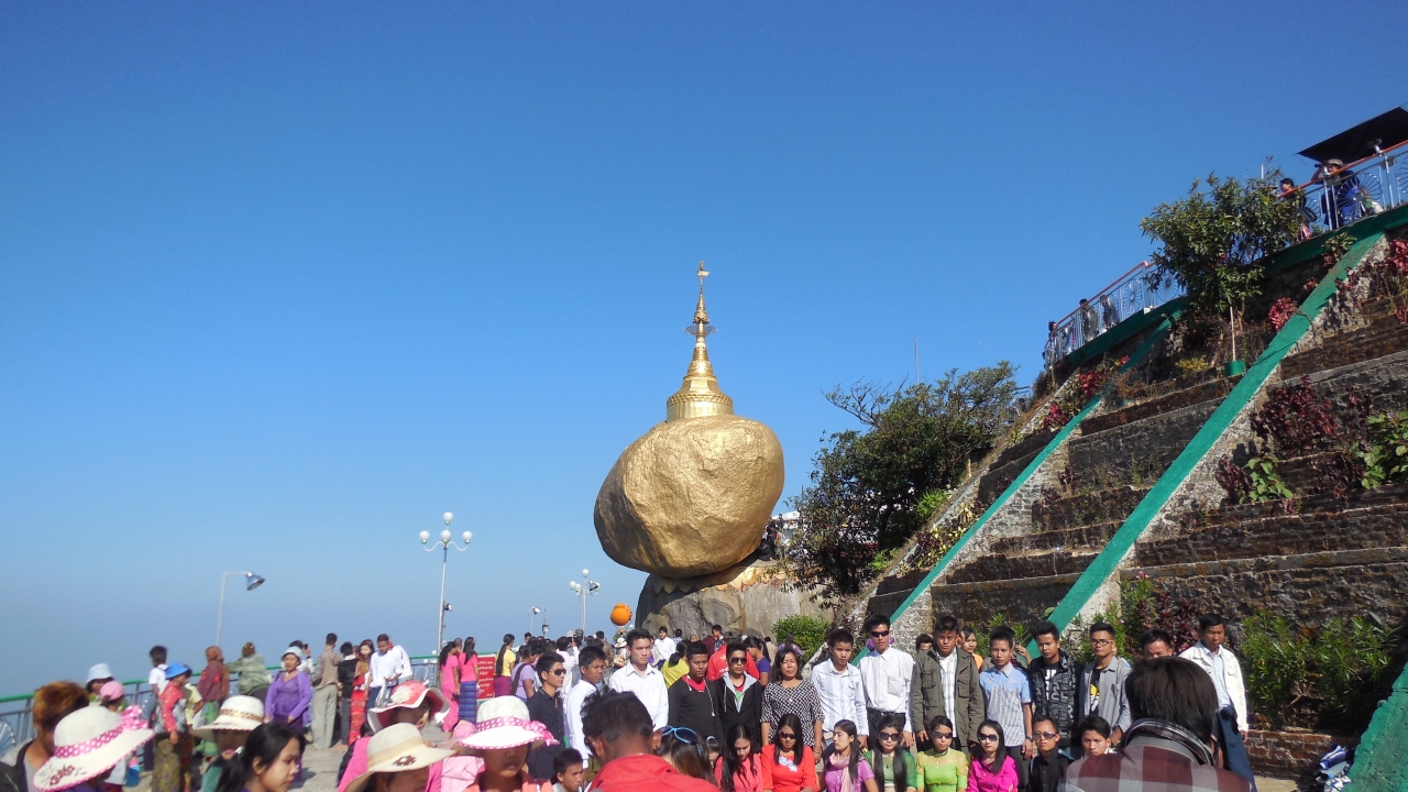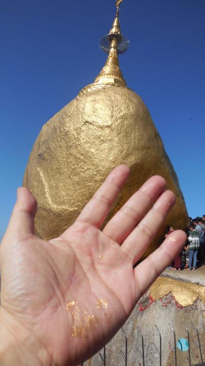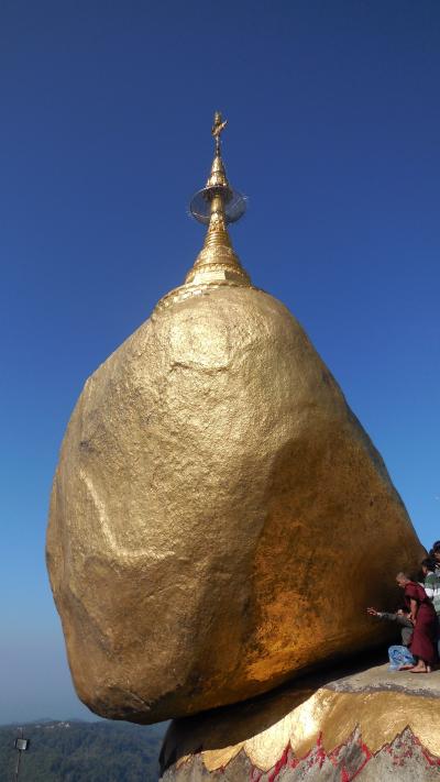 不思議な光景、男性だけは石に触れるとあってありがたく触ると金箔が手に着いた。真っ青な空を背景とした黄金の岩とパゴダ、極めて強く印象に残った。- 旅行時期