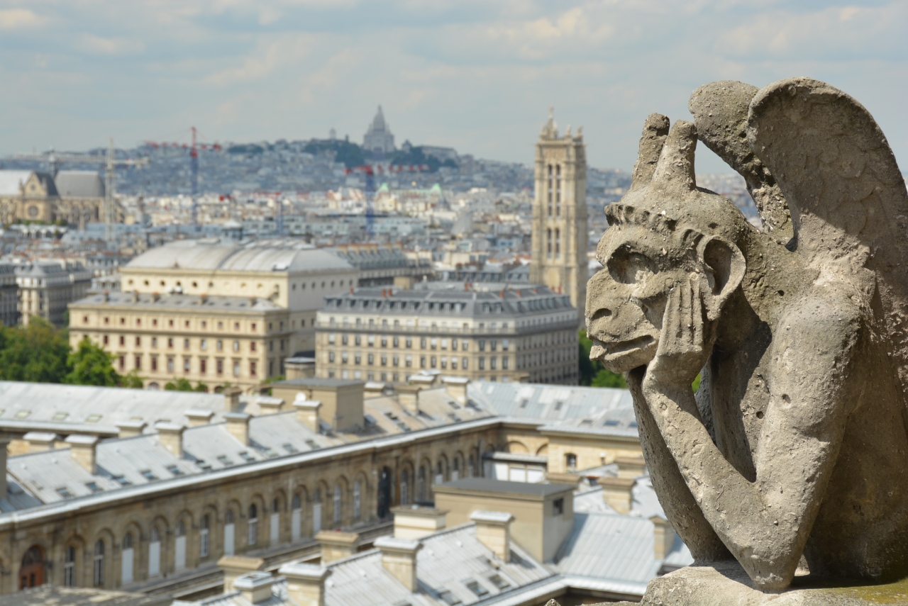 到着してまずは正面から向かって左側に連なる列に並びました。ある程度まとまった人数で階段を上るので、列はなかなか動かないと思うとどどっと動く、の繰り返しです。耐えること1時間、らせん階段を上っていくとパリを見下ろす悪魔くんと巡り合えます。