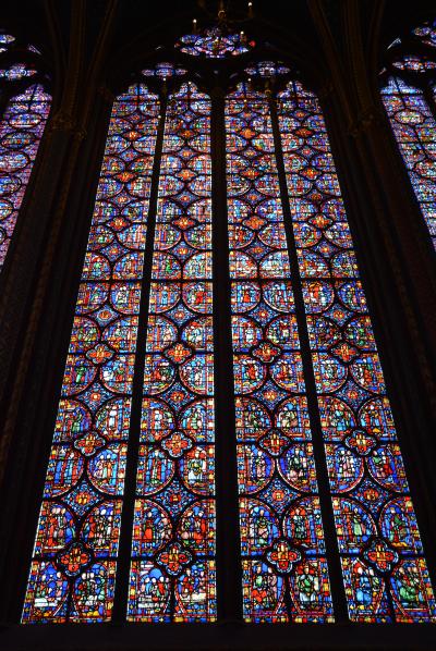こちらも気合を入れて並びました。カフェで買ったフランスパンを昼ごはんとして食べながら1時間は並んだと思いますが、それだけの価値は充分にありました。最高裁判所の敷地を入り、暗い教会の中を入っていきます。メインは2階部分に上ってからの四方に張り巡らされたステンドグラスです。個人旅行の良さ、じっくりと気の済むまで光の中の別世界を楽しみました。数年前から修復工事中でして、来年には完了するとのことです。もう終盤の模様でしてメイン部分がきっちり見られたので工事の影響はないといえます。