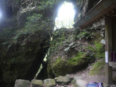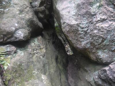 そんな参拝道を15分くらいあがると、さらに険しい参拝道が・・・!今までは、ロープによるてすりだったのが、ちゃんと、鉄製のてすりになりました(どんだけ急なんだ)そのてすりを持ちながら登ること5分程度。突如手すりが消え、足場もなくなり、(へ?どこを登れと?!)と思い、顔をあげると、大きな岩の裂け目が!これこれ。ネットで色々調べると、この裂け目の先に本殿があるとのこと。。。。なるほど。リュックを背負ったままでは通れない・・・・と、リュックを下ろし、横歩きで無事に通過。うちのちびっこは、普通の態勢で通ることができました(なにせ1歳児(笑)