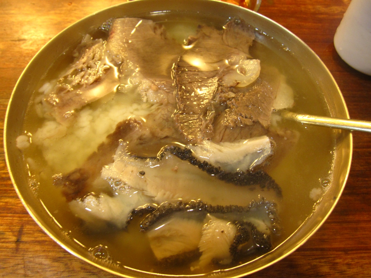 透明なスープの中に薄切りのお肉と内臓、ご飯が入ってます。