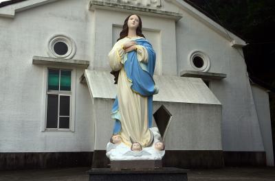 若松港からすさまじく狭い上にカーブや勾配が連続する道路を延々とたどった先の谷底にこの教会が建っています。