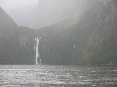 テ・アナウから15人ほどの現地のツアーに参加。クルーズのボートが出港する頃から雨になりパンフレットで見た青い空、紺碧の海は駄目だったが雨で水嵩の増えた滝の色、氷河で削られた垂直にそそり立つ山の色、海、空どれもがモノカラーで広大な水墨画のようだった。
