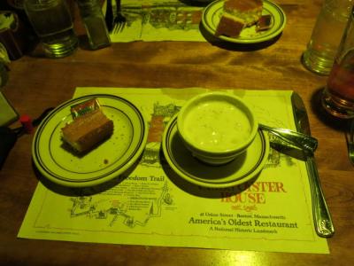 町を散策している時に偶然このレストランの前を通りかかりガイドブックで見かけたレストランなので入った。待ち時間が40分との事だったが1時間弱待ってテーブルについた。古い石畳の通りに面したクラッシックなビルは何時建てられたかは不明だがこのレストランは1826年にオープンした。(自称アメリカ最古のレストラン)店の名はオイスターだがロブスターが売りらしく店内にはロブスターの入った大きな水槽が2つあった。1.5ポンド(640グラム)の地元ニューイングランド産をボイルしてもらった。さすがにジューシーで甘みのある挟みの部分は最高だった。ボストンクラムチャウダーで満腹!