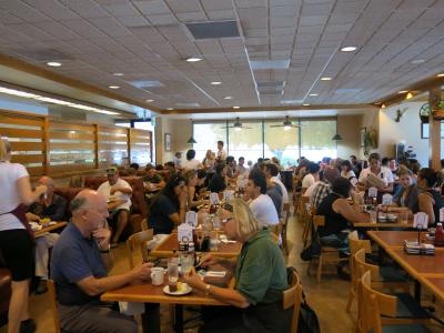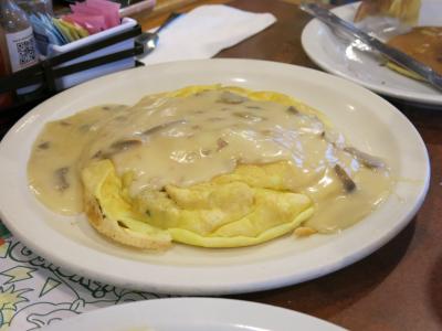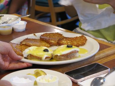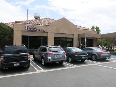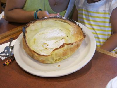 オレンジ郡の南にある郊外住宅都市Aliso Viejo市の小さなショッピングモールに有り日曜日の昼食時だったので満員で20分待ちだった。メニューを借りてあれこれ選んでいたら20分は直ぐ過ぎた。伝統的な朝食の定番パンケーキやオムレツにベルギーワッフルがベースで南カリフォルニア特産のイチゴやメロン等のフルーツ、ベーコンやソーセージ等トッピングが豊富でどれも食べたいので6人6種をオーダーしてシェアーをした。6人の一番人気は「ダッチ・ベイビー」(Dutch Baby)だった。