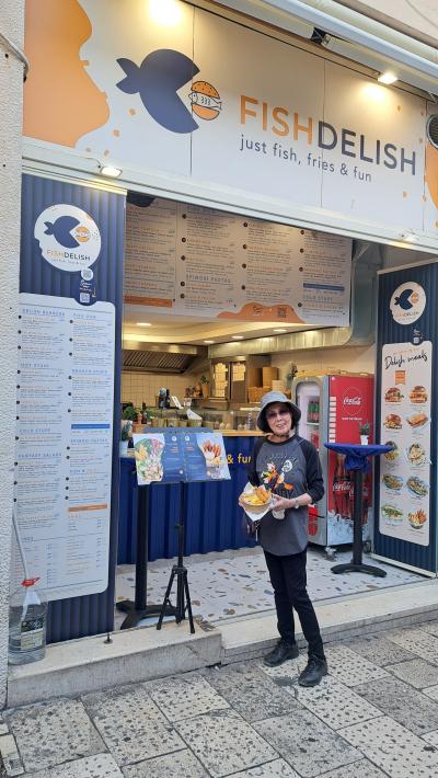 スプリットに着いてまずは腹ごしらえ。エビフライとポテトフライ、12ユー...