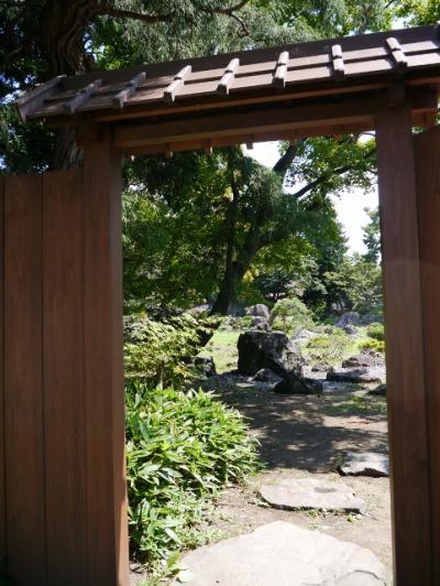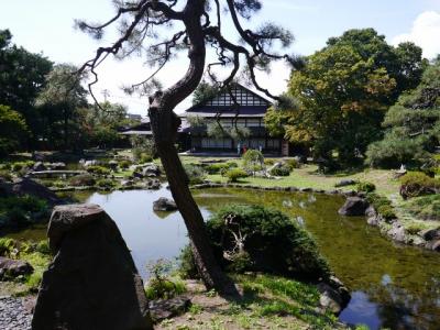 枯滝の石組まで歩くと、旧加藤家住宅を池の向こうに望める。