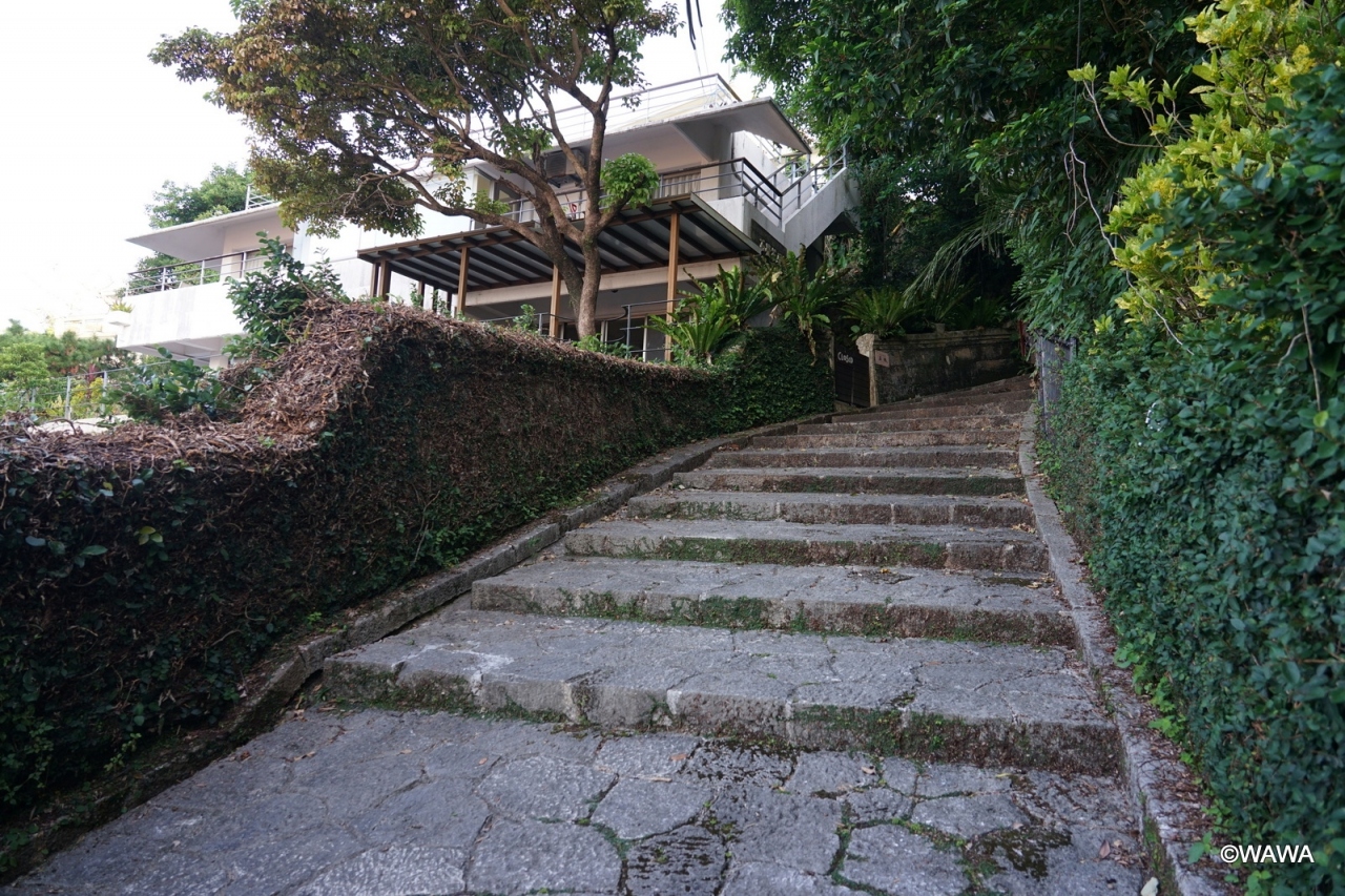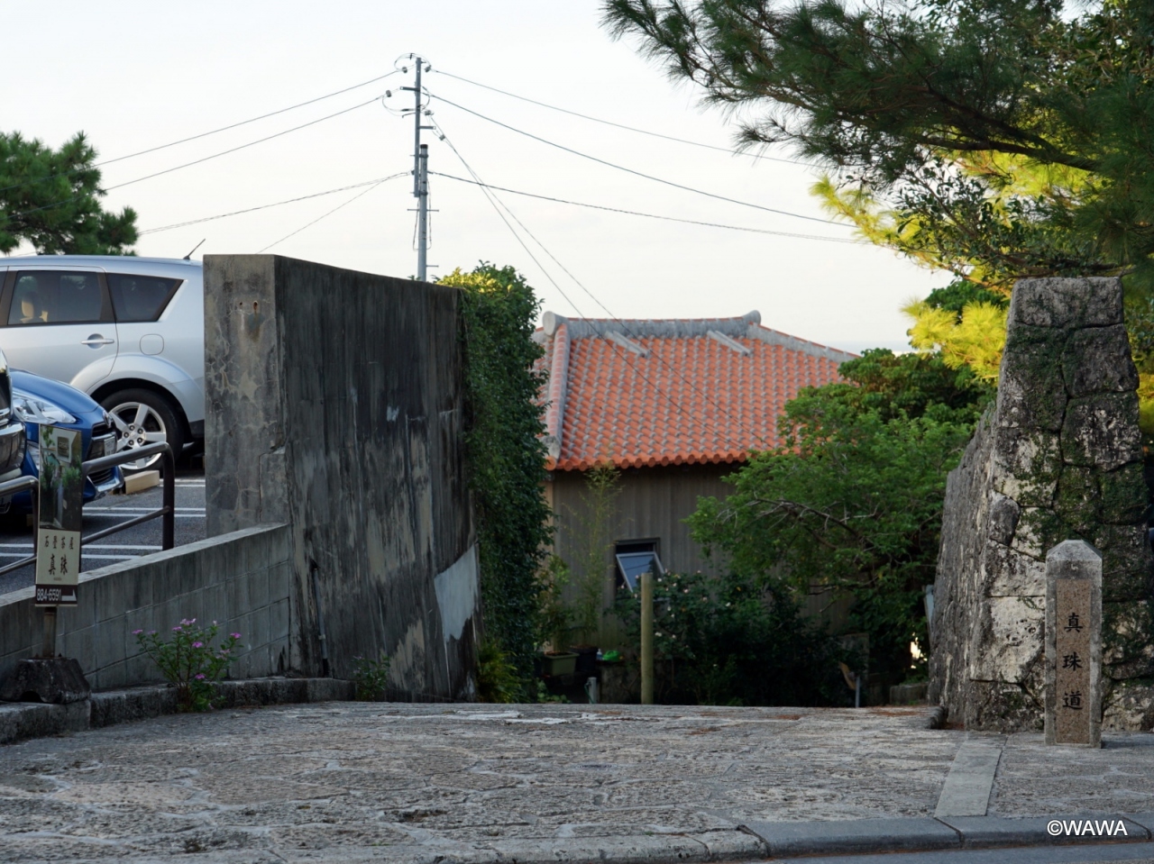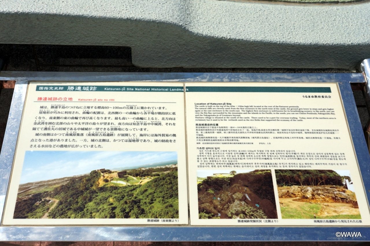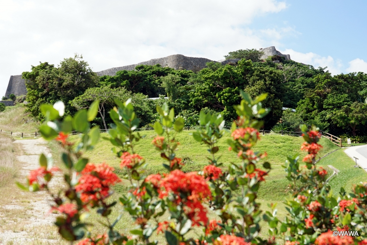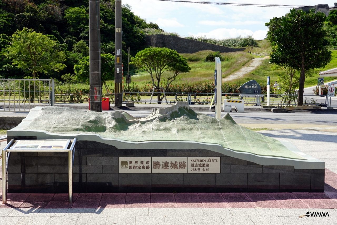 飛行機の那覇空港到着が1時間も遅れたので、勝連城跡観光は無料駐車場から道1本渡った場所から城跡を見上げるだけに留めました。それでも開けた場所に立ち、緑の芝生で覆われた丘の上に波打つ石垣を見上げることが出来たので満足です。