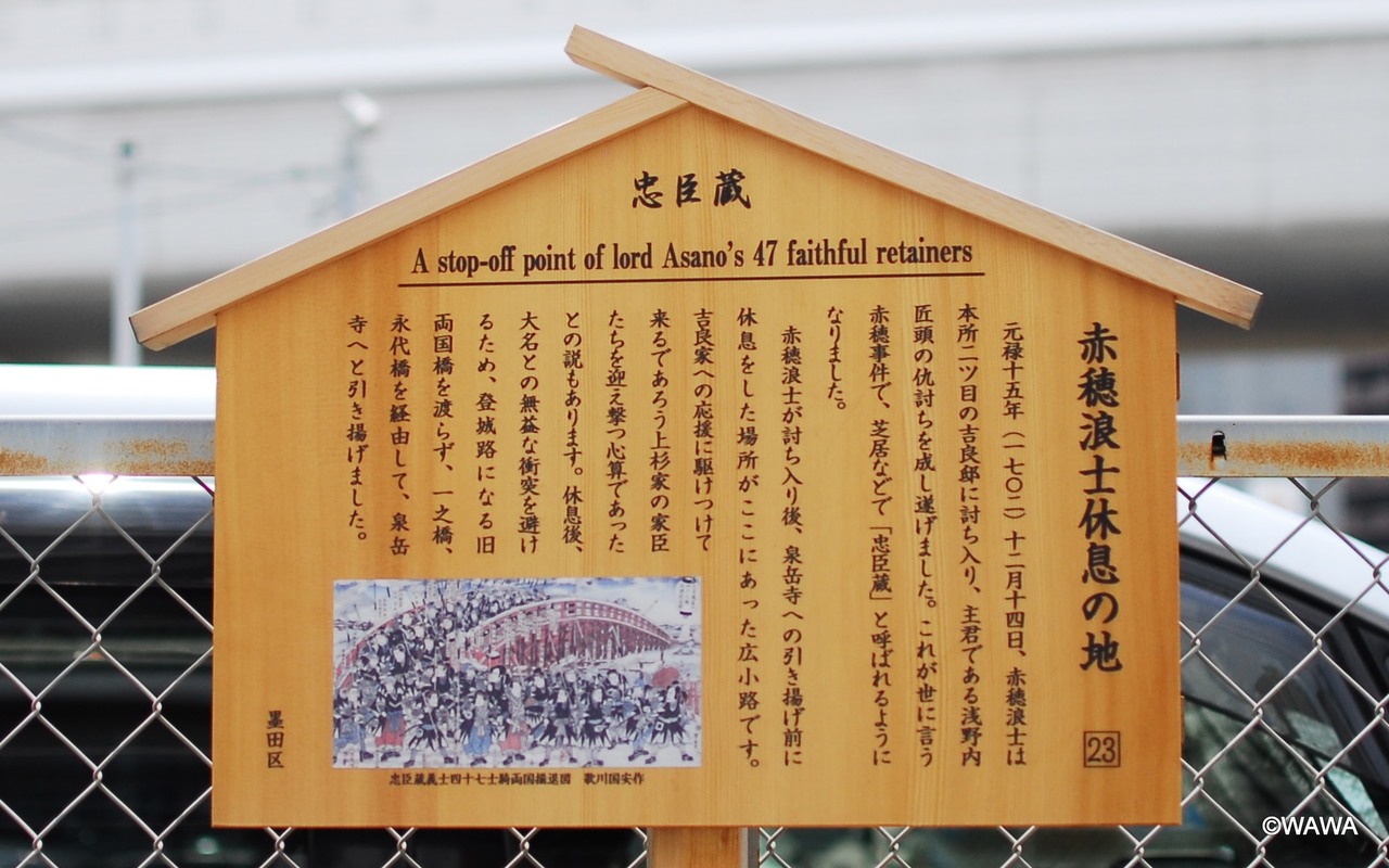 両国周辺は案内板だけ観光名所だらけでした。この赤穂浪士休憩の場所も「案内板も無い」より良いのですが、旧両国橋の案内板などと月極駐車場のフェンスに案内板を3つも取付られてもガッカリです。