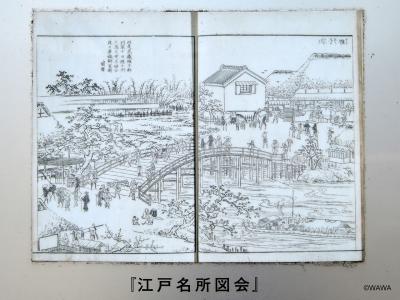 帷子川は江戸名所図会の題材にもされる旧東海道の名所でした。帷子川に架かる帷子橋の袂には茶店が並び、周りにはのんびりとした人々が描かれています。