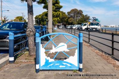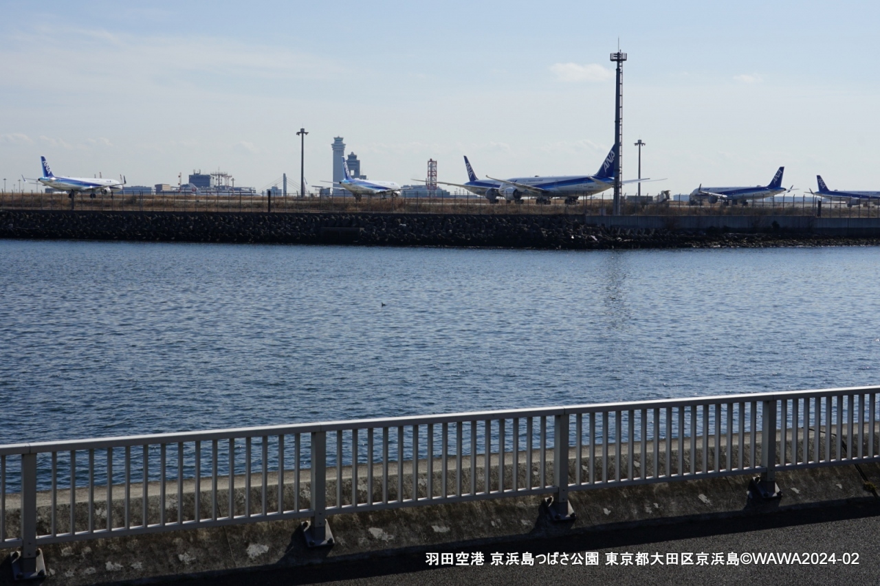 京浜島突端のつばさ公園から羽田空港に離着陸する飛行機を眺めました。東京湾を埋立てて造られた京浜島は工場や倉庫がひしめく埋立地ですが、突端のつばさ公園は羽田空港のB滑走路に近いことから、望遠レンズがあれば管制塔や、ANAばかりの駐機場の飛行機なども眺めることが出来ました。
