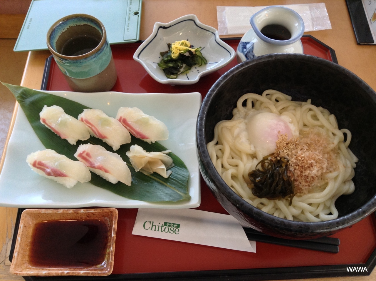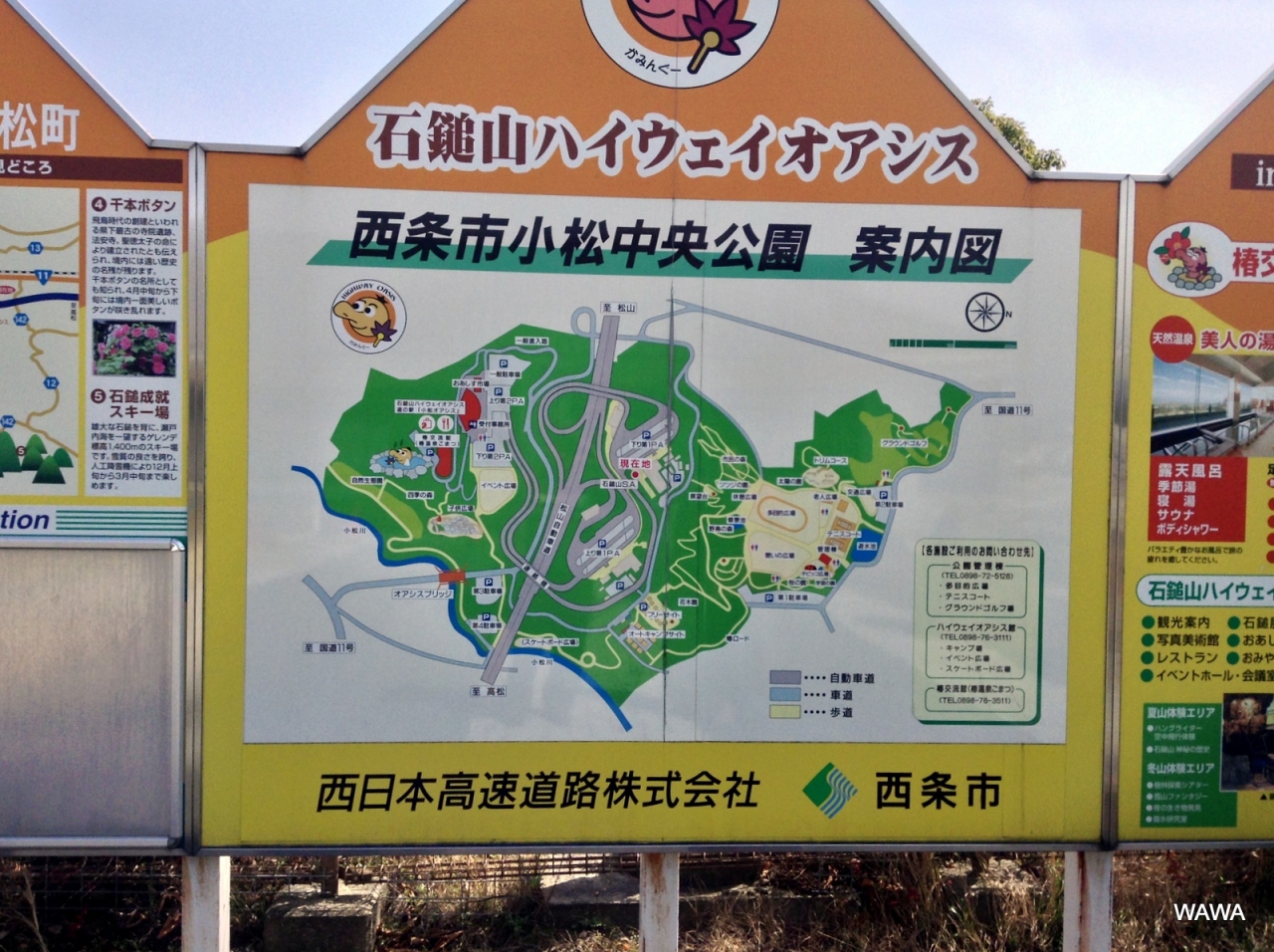 石鎚山サービスエリアは椿温泉や小松公園などと隣接した大きなサービスエリアです。食堂もあるので昼食を食べましたが、西讃地区(香川県西部)のつもりで「鯛寿司+うどん」を頼んだ所、暖かくて甘ったるい出汁を腰のない細いうどんにぶっ掛けて食べるものでした。讃岐うどんとは似ても似つかない食事にがっかりしました。