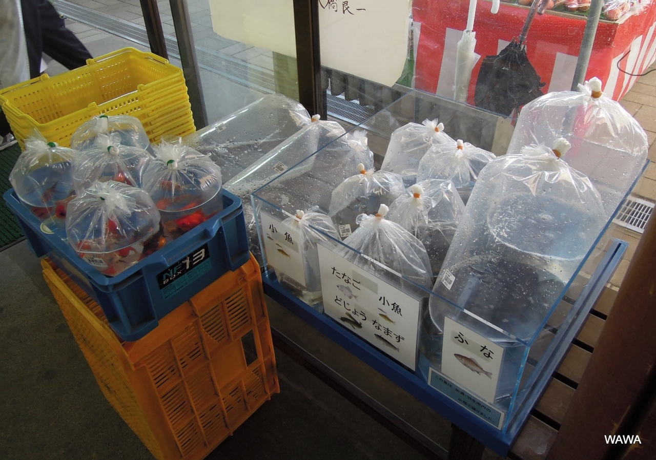 小鮒、タナゴ、金魚、メダカなどが、空気を一杯に詰めたビニール袋に入れて売られています。甘露煮などの材料として生きた小鮒が長野県内のスーパーで販売されているTV番組「秘密の県民ショー」を見たことがあります。はたして、食料でしょうか飼育用でしょうか?