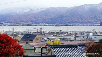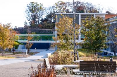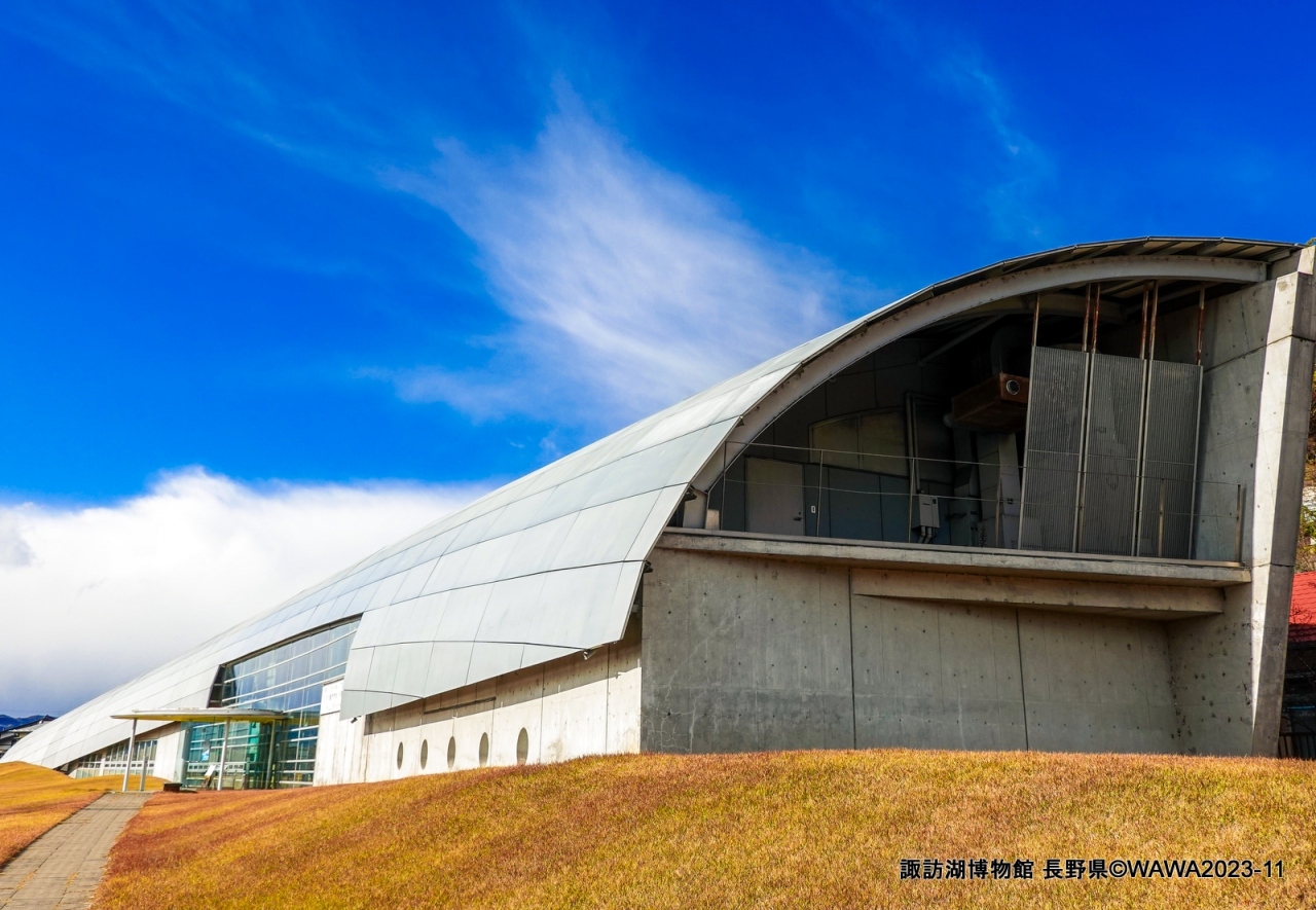 諏訪大社下社の春宮~秋宮2社の参拝を終え、10分ほどの車移動で諏訪湖湖畔に建つ下諏訪町立諏訪湖博物館 赤彦記念館を見学。ミュージアムに隣接する無料駐車場の脇には下駄スケート発祥地の記念碑のほか、伊東豊雄氏の設計した建築自体も楽しめました。