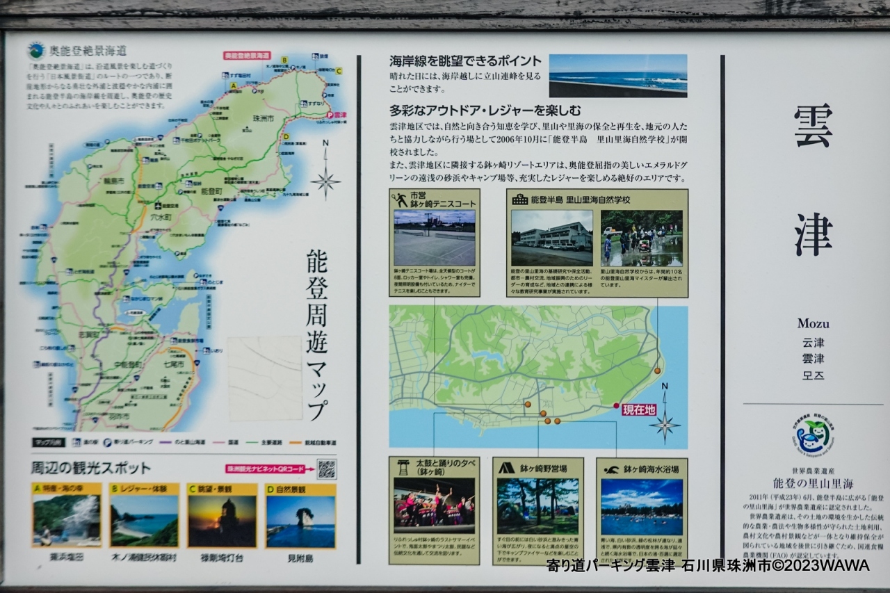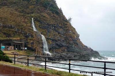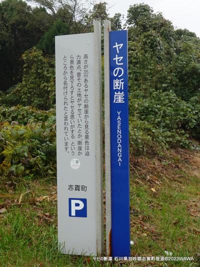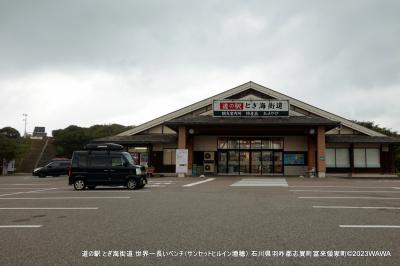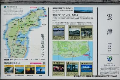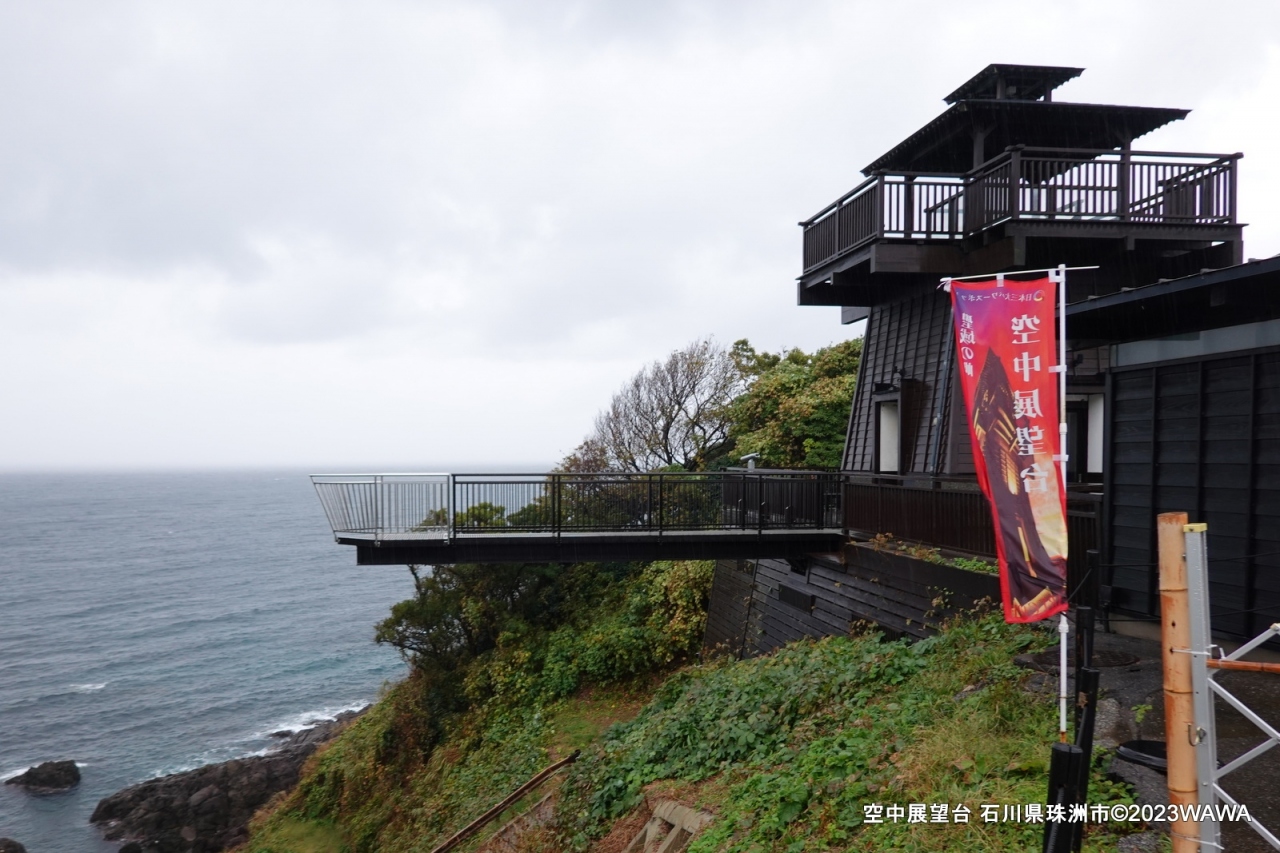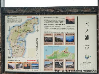 晴れた日には能登の海岸越しに立山連峰を一望できる景勝地とのことでしたが、訪問時には生憎の大雨。能登半島東端部に位置する海辺の無料駐車場からから、雨の海と空一面の雨雲のを眺めるだけに留まってしまいました。