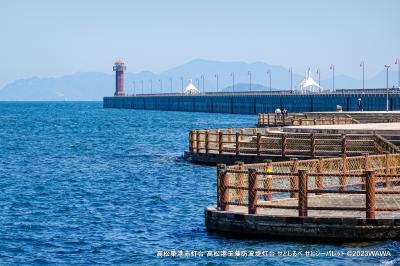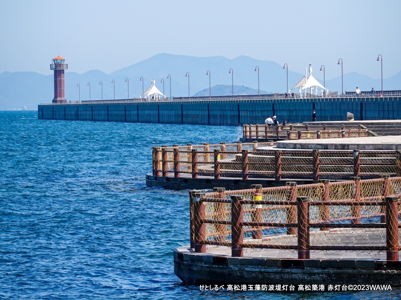 「せとしるべ」こと高松港玉藻防波堤灯台は高松港の北側を北東に伸びる防波堤の先端に建つガラスの赤灯台です。防波堤の上は歩きやすい遊歩道になっているので瀬戸内海を見ながら1㎞近く歩くと灯台に到着です。夜もライトアップしているのでオススメです。