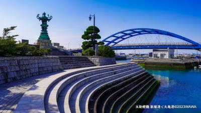 灯籠の場所からからは、丸亀港(新堀港=新堀湛甫)を挟んで京極大橋を見晴らせます。
