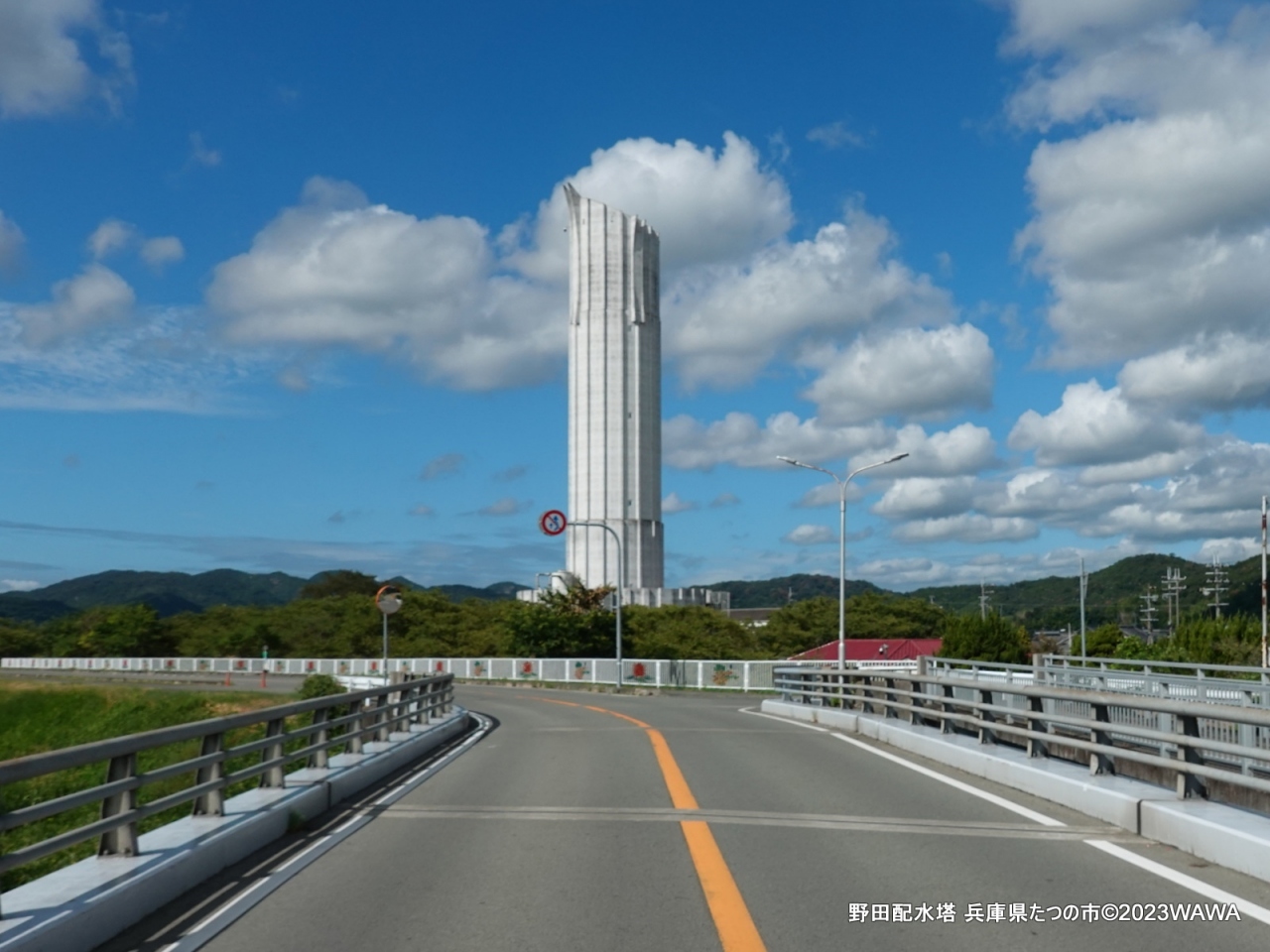 重要伝統的建造物群保存地区に選定される龍野の町並み散策の次に、龍野公園経由で相生港を目指しました。途中の揖保川沿いの野田水源地近くに西日本一の高さを誇る野田配水塔があります。その塔の川沿いにある河原が「きらめきスポーツ公園」です。