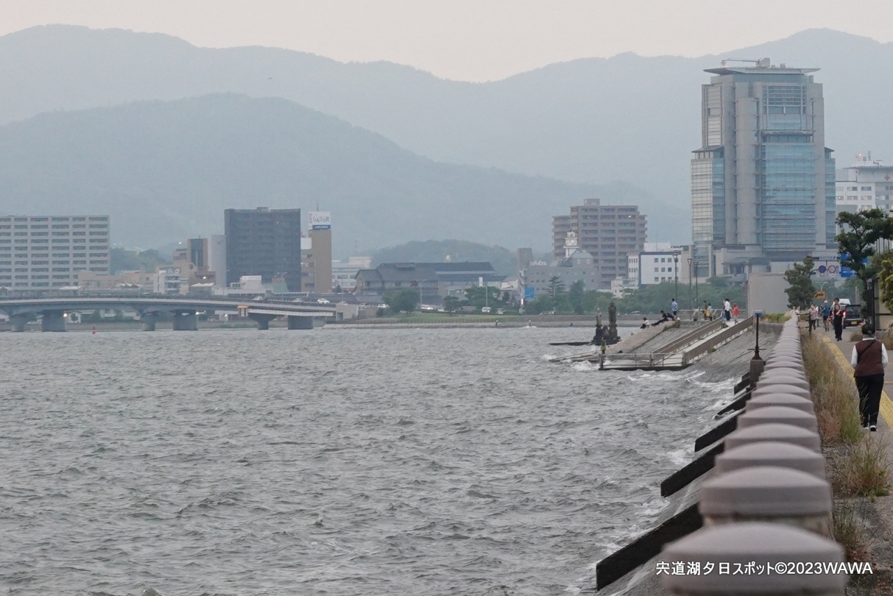日御碕散策を17:30に終え、レンタカー90分ほどのドライブで19時に松江市の宍道湖際の夕陽スポット付近に到着。夕陽スポットの中心地と思われる袖師地蔵の手前(数百メートル西)には路肩に無料駐車場もあり、宍道湖の湖面に沈む夕陽を手軽に楽しめました。