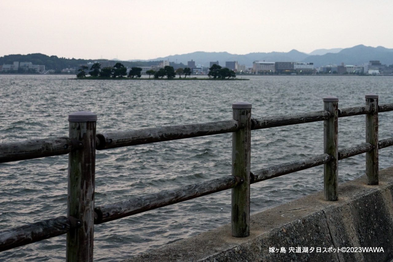 嫁ヶ島は宍道湖の夕陽を楽しめる夕日スポットテラスの真西に浮かぶ小島です。宍道湖沿いの広い範囲から遠望することは出来ましたが、沈む夕陽にからめた景色を楽しむなら島の真東に位置する場所へ陣取る必要がありますが、ピッタリの場所には道沿いに駐車場が無いので手間と時間が必要なようです。