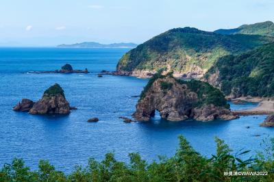 妙見浦の「穴の口岩」を、妙見浦とは離れた象さん岩展望所から遠望すると「象さん」に見える