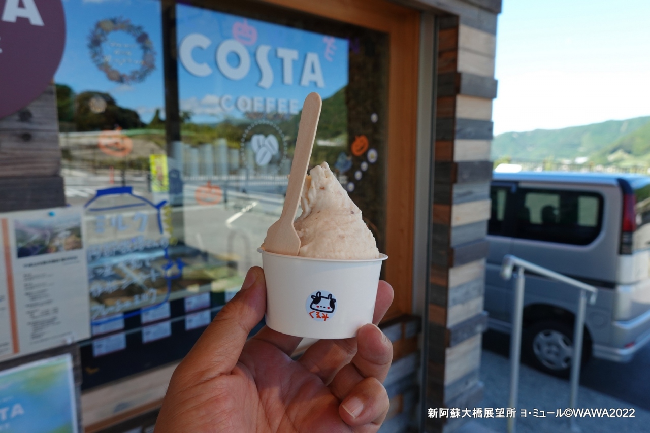 新阿蘇大橋を軽く眺めることが目的でしたが、広い展望駐車場の洒落た建物でジェラートを販売していたので食べました。