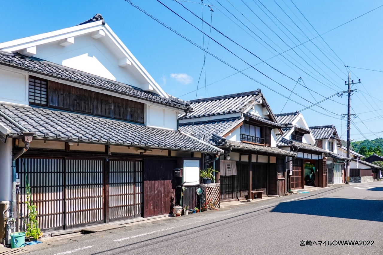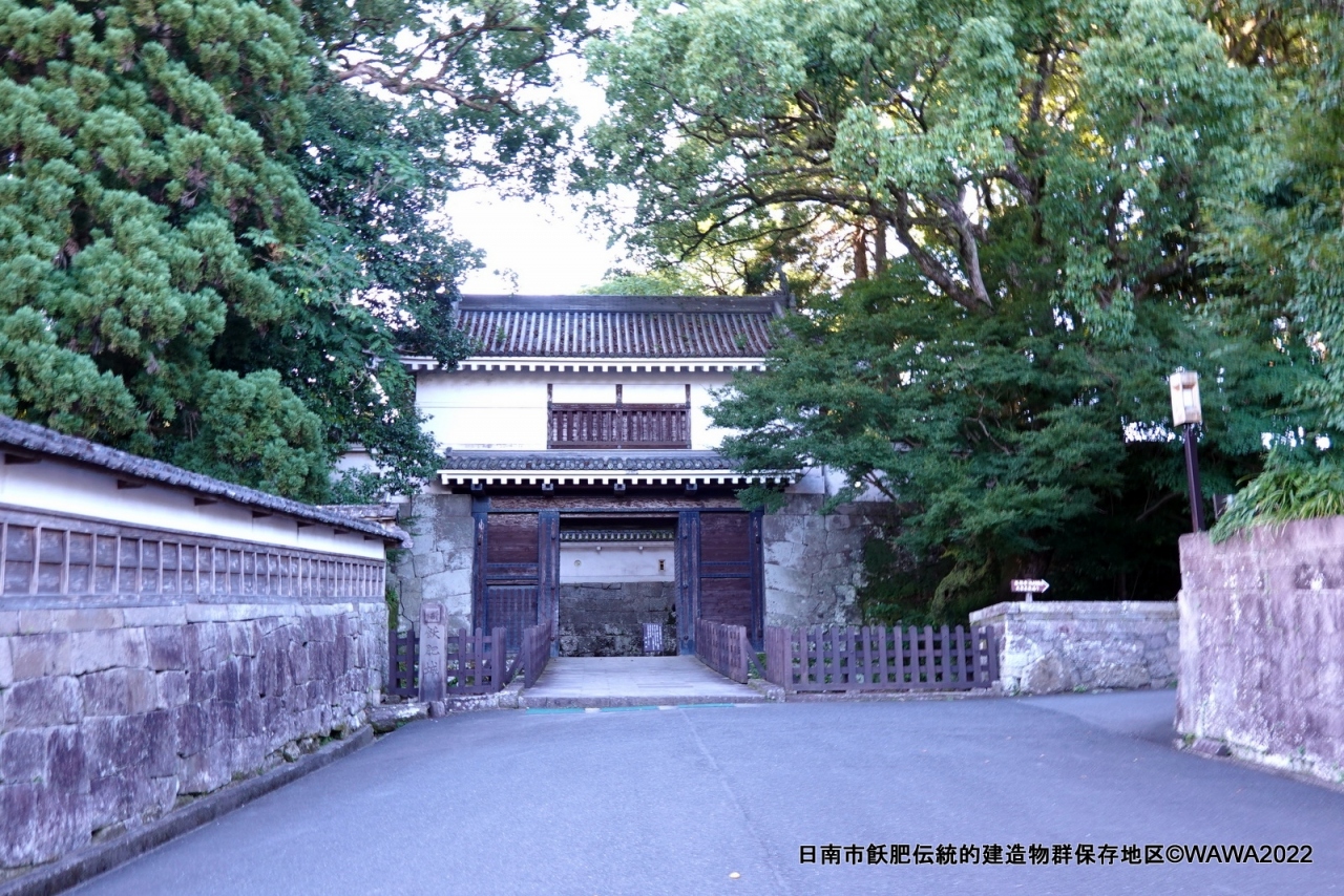 レンタカーで都井岬から宮崎市内への折り返しで、飫肥城下町の重要伝統的建造物群保存地区へ立寄りました。武家屋敷街はバラエティーに富んだ商家町と違って、生け垣や長い壁だらけの町並みが多いのですが、夕方5時も回っていたので内部見学できるはずもなく、石垣や壁を見ただけで終わってしまいました。