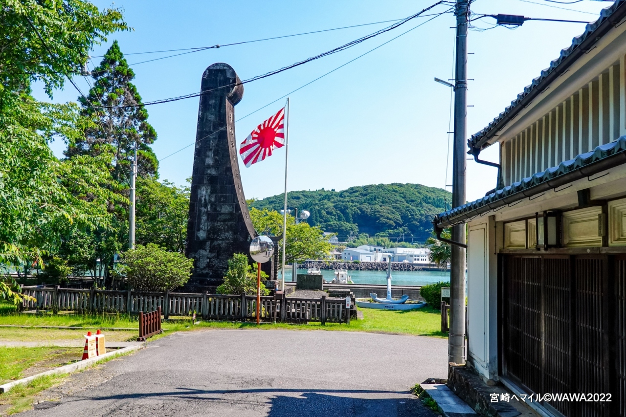 重要伝統的建造物群保存地区に選定されている美々津町の町並みの港側に、大きな日章旗が掲げられた「日本海軍発祥の地碑」がありました。最初は「坂本龍馬の海援隊??」とか思ってみましたが、神武天皇の東征神話が元になっている記念碑でした。