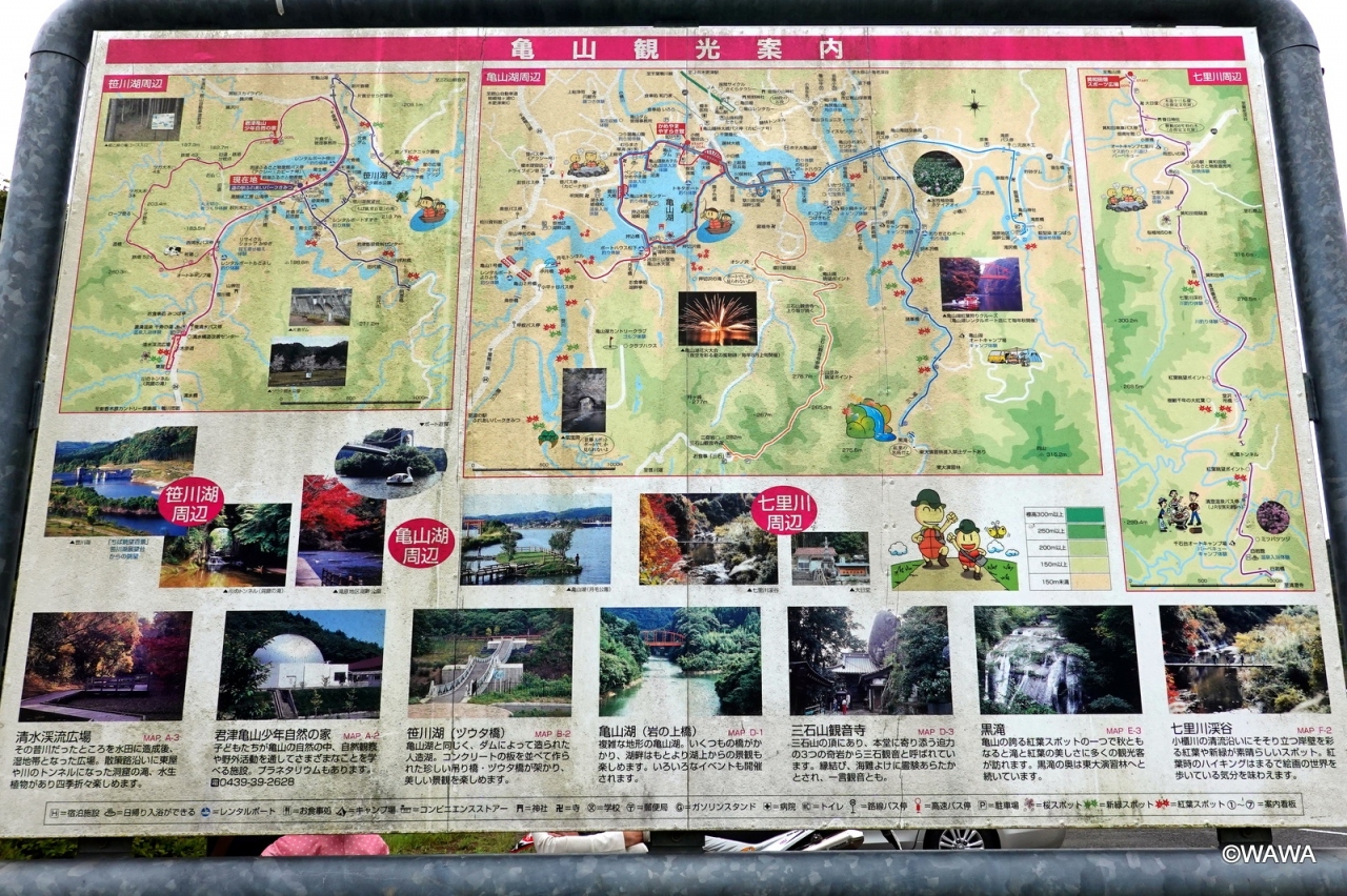 道の駅に設置されている古めの観光地図案内板には、笹川湖周辺の観光案内>「川のトンネル(洞窟の滝)」として表記されていました。- 旅行時期