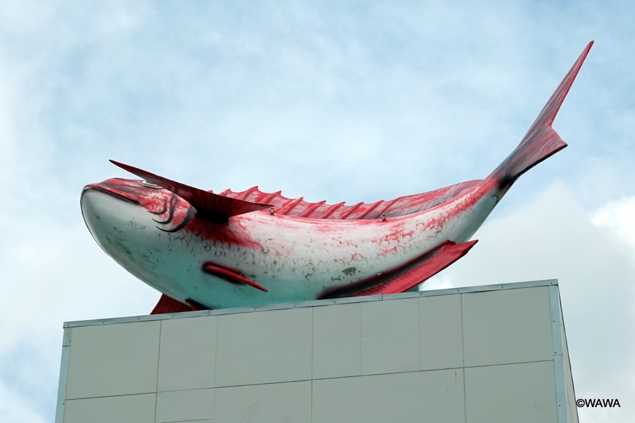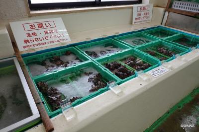 小湊港ぎわに利用者無料の駐車場付きで立地する「活き活き小湊ウオポート」は、小湊漁業協同組合直売所で「道の駅」の漁協版の様な産直品とおみやげ品の売店施設です。店内の水槽には活魚が泳ぎ貝やイセエビも販売され、屋上では大きなブリキ?の鯛が跳ねていました。