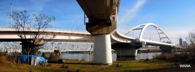 長柄橋から淀川大堰にかけての景色は沢山の橋梁や水門で変化に冨んでいます