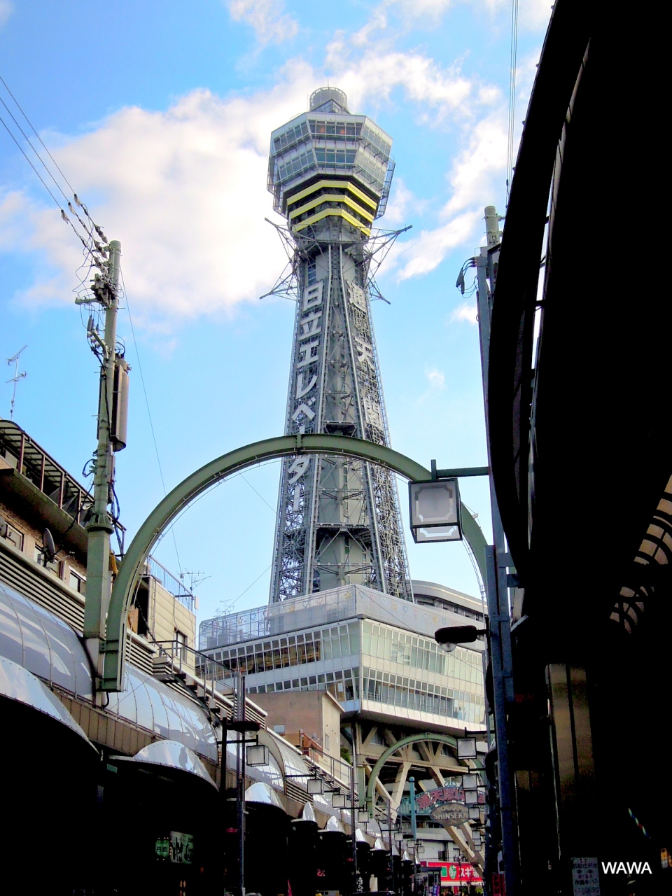 通天閣本通商店街は、第5回内国勧業博覧会の会場跡地を使って1912年に開業した「ルナパーク」や「通天閣」に併せて開発された「恵美須通」を出発点とした長い歴史のある商店街です。当時は恵美須通の北詰に恵美須門が建てられ、市電の駅と共にルナパークや通天閣への表玄関として栄えて来ました。買物中心とは言えませんが現在でも沢山のお店が並ぶ活気ある商店街です。