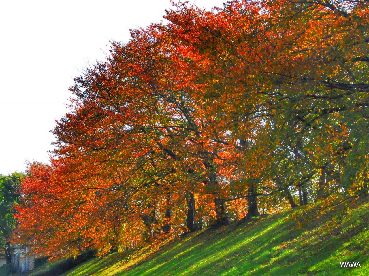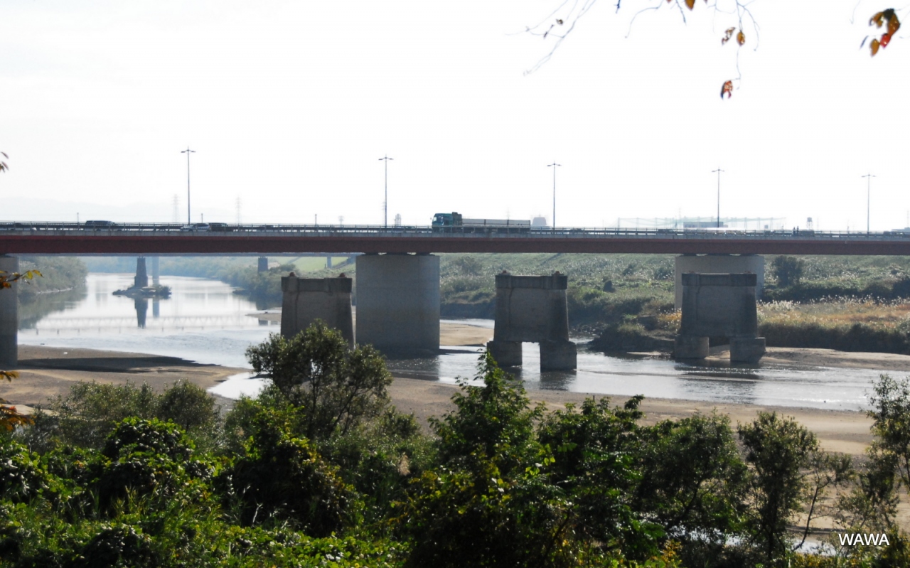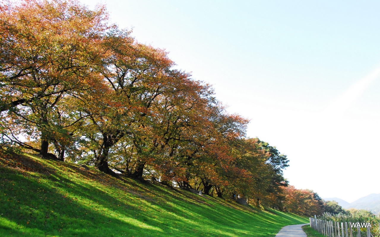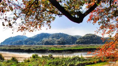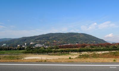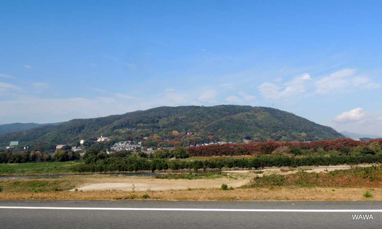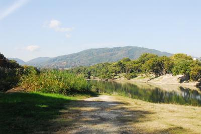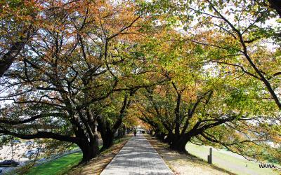 桂川、宇治川、木津川の3つの川が出会い淀川となる“三川合流”の地で河川敷と堤を利用した長い公園です。堤には1,400mに渡って桜並木が通っているので春の花見はもとより、紅葉シーズンにも普段とは違う景色が楽しめます。行き方としては御幸橋の中ほどから河川敷に降り、無料駐車場に車を停め、後は徒歩で散策しました。