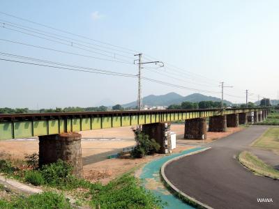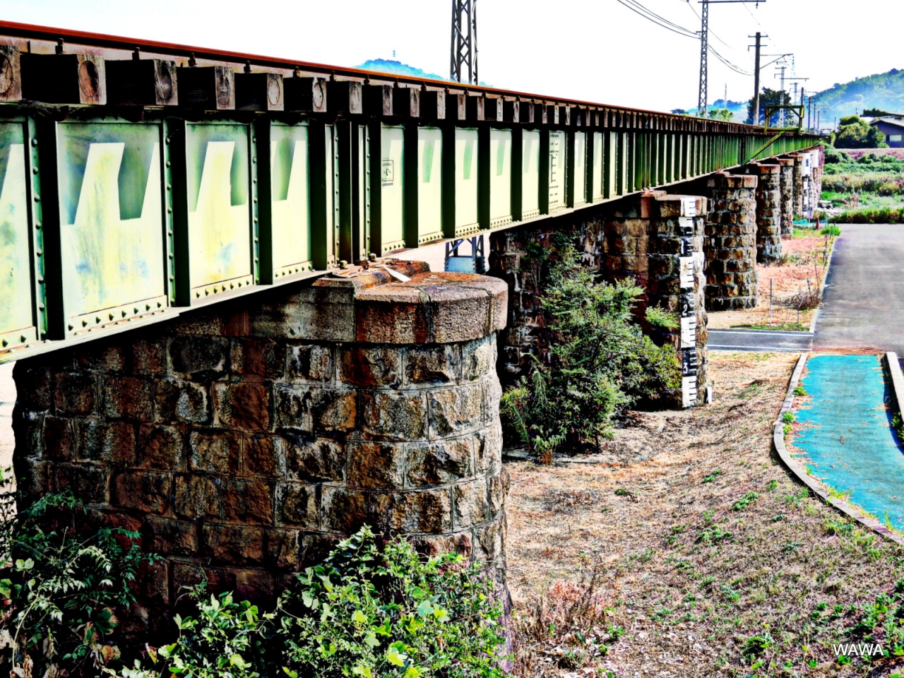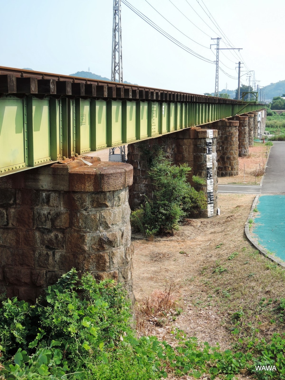 ことでん(高松琴平電鉄)琴平線の羽間駅~榎井駅間を流れる土器川を渡る土器川橋梁は、大正15年製の鋼製上路プレートガーダー橋です。全てが石積の十六蓮橋脚は、近代化産業遺産に相応しく時代を感じさせてくれます。橋の周囲は河川敷公園になっており、簡単に近づくことが出来ますので金比羅さん参拝の折にでも見学してみてください。