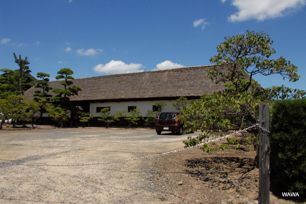 小比賀家は江戸時代に代々に渡って村の庄屋を代々勤め、時には数か村を管轄する大庄屋を勤めることもあった茅葺の長屋門が特徴的な大きな家です。田圃の真ん中に立つ塀で囲われた家屋は、現在でも住居として使われていますので、外観から見学出来るのは午門(茅葺の長屋門)だけです。主屋や庭園など内部の見学は毎月第3日曜(2012年11月時点、要確認)にのみ有料開放されています。なお、見学者用の駐車場は無く、田圃の真ん中とは言え適当な駐車スペースも見当りませんでした。