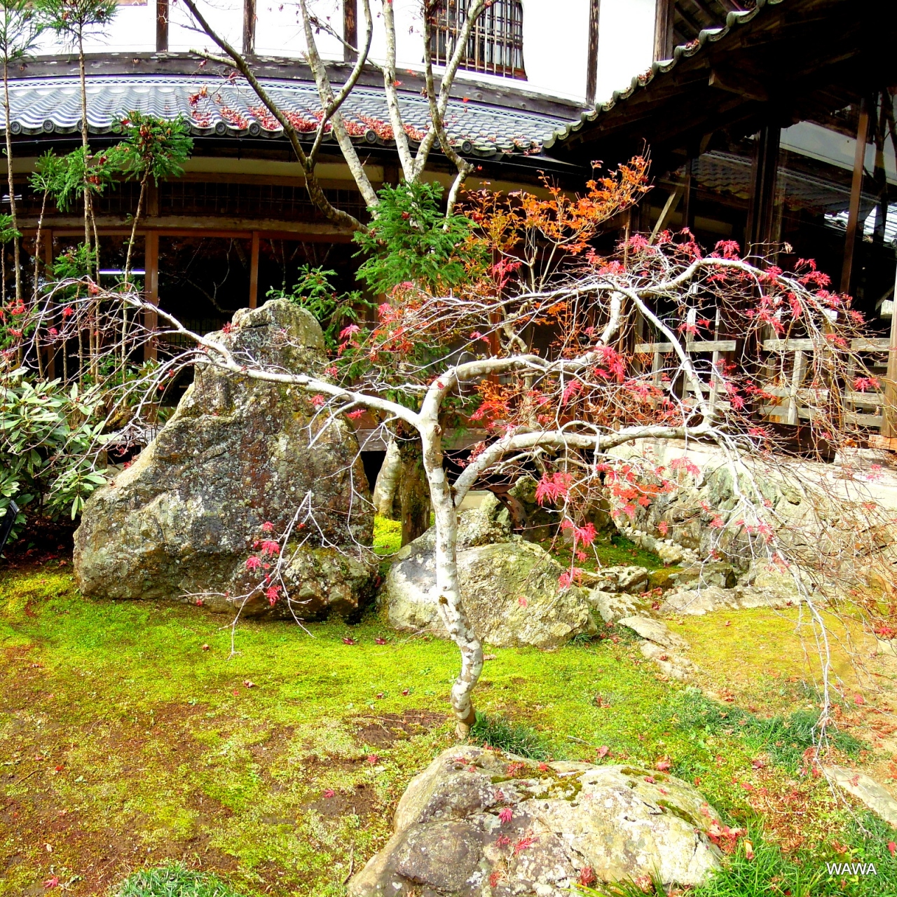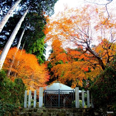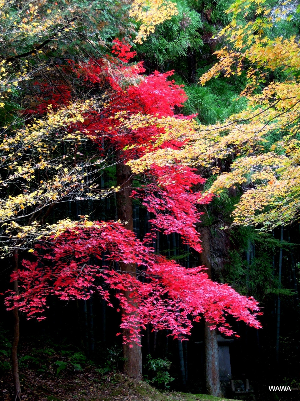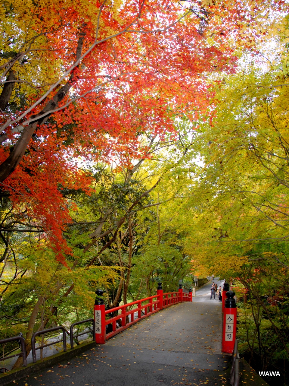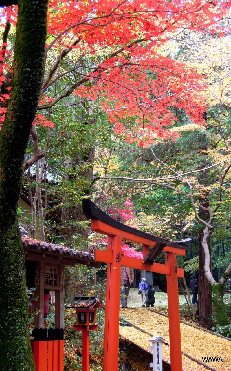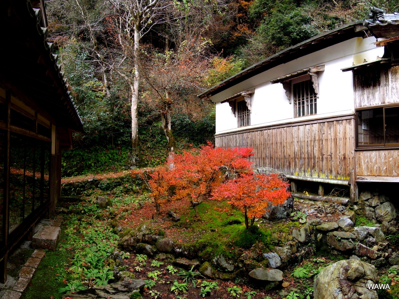 鯖街道(国道)沿いに位置する中国風の山門付近に車を停め600mの急な坂道を上り詰めるとお小さい寺が建っていました。山中のためか紅葉にはムラがあり、途中の山路は植林の針葉樹ばかり、京都市の天然記念物にも指定されている樹齢700年を超える楓も大き過ぎて紅葉部分は遥か上空でした。人も少なく山寺の雰囲気は楽しめるのですが、紅葉としては今ひとつでした。- 旅行時期