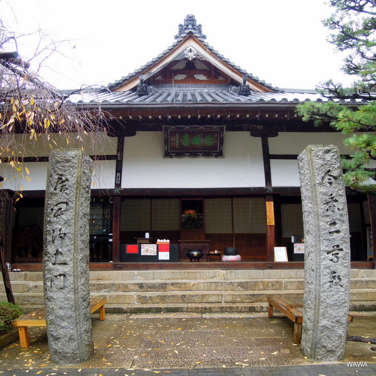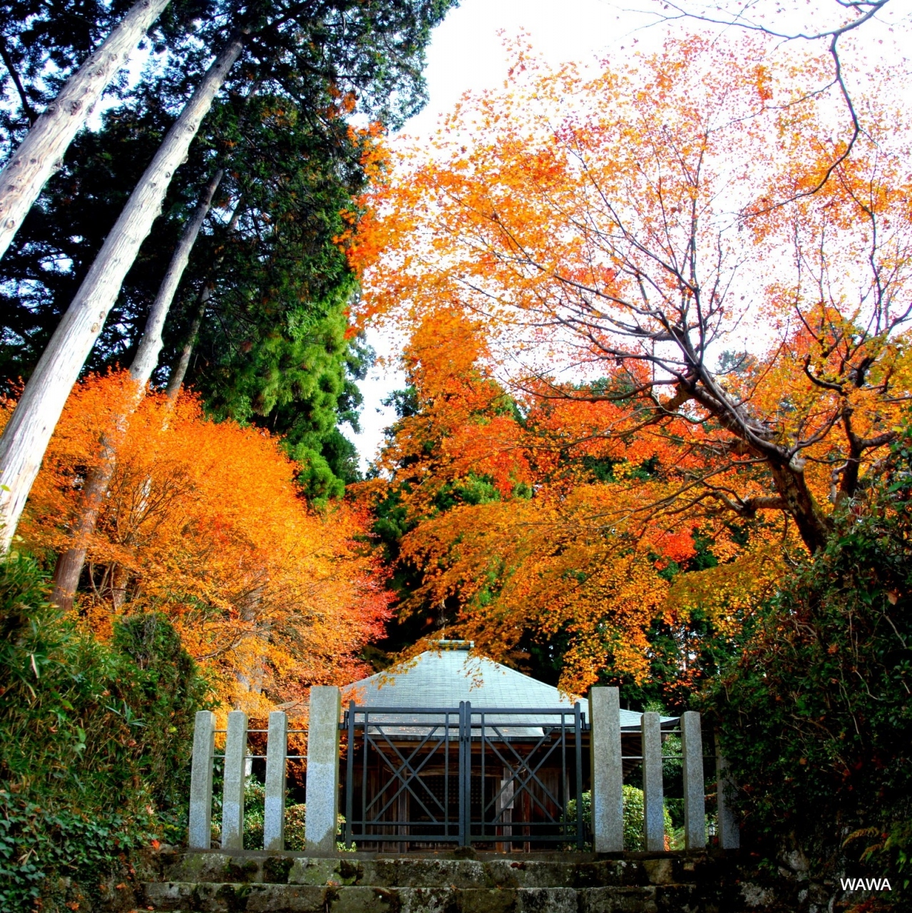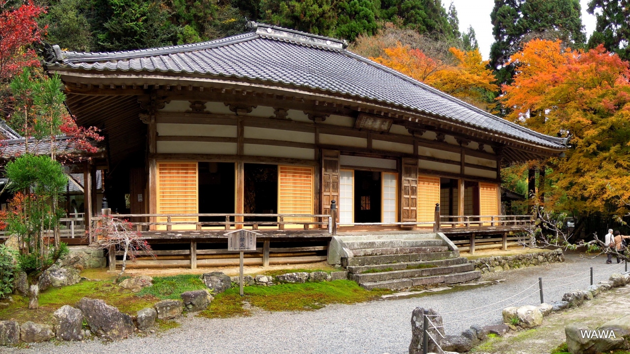 大原の勝林院と三千院の間に屋根のカーブが素敵な御堂があります。入場料はかかりませんが、周囲の柵から中には入れませんが、正面や右側から見ることが出来るので、背景の紅葉と小振りながら美しい御堂の景色を楽しむには十分です。人で溢れる三千院では事前のイメージとギャップを感じる方にお勧めの場所です。