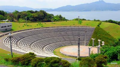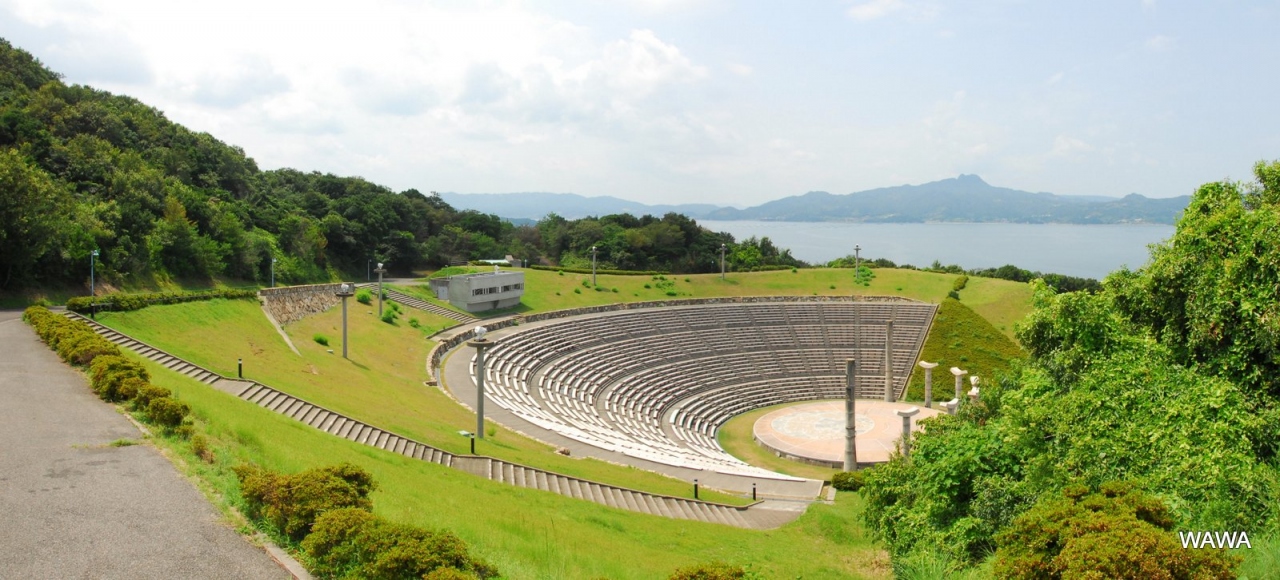 さぬき市野外音楽広場テアトロンは、大串半島北端部(大串自然公園)にある中四国一の規模を誇る多目的野外劇場で、音楽・演劇などを満喫できます。演目が無い時でも瀬戸内海国立公園の自然豊かなすばらしい景観を背景に、白い石の神殿のようなテアトロンは見ごたえ十分です。