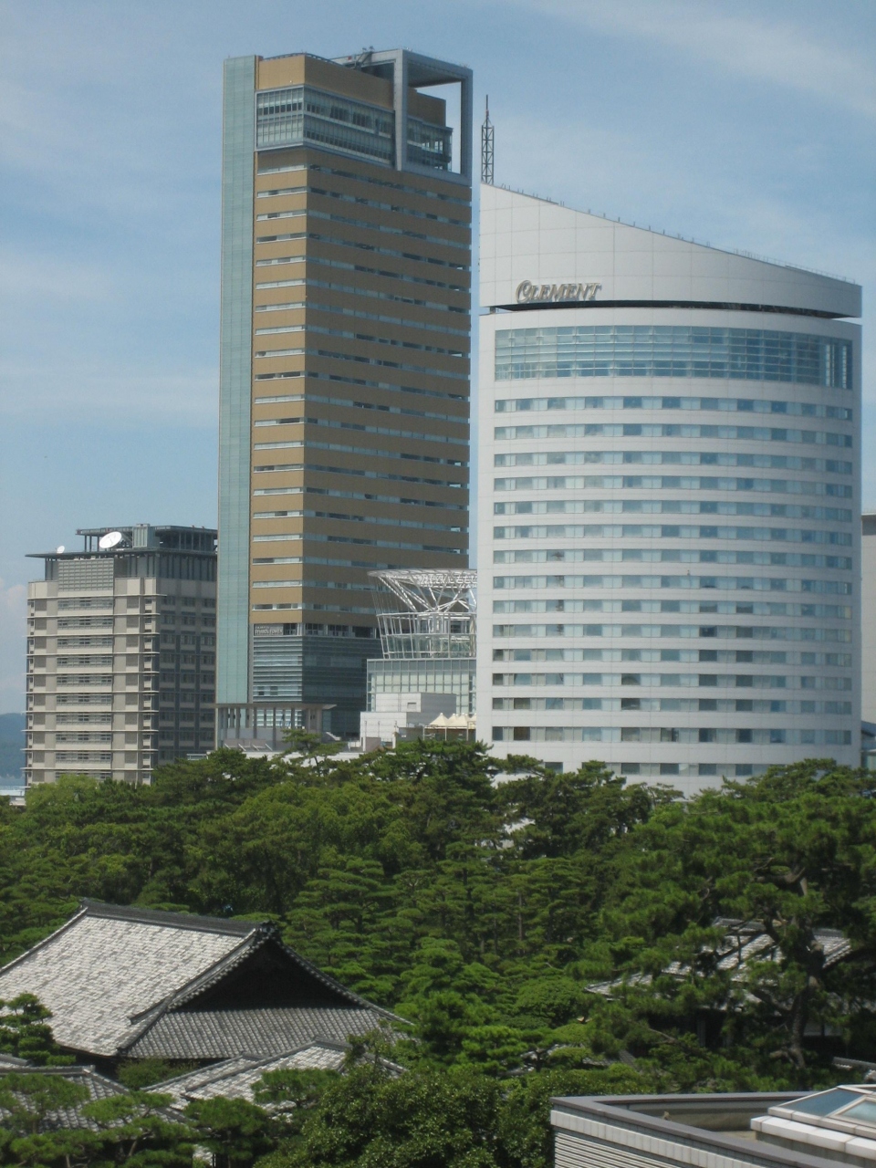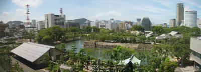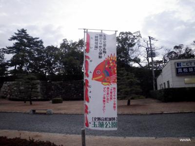高松城址を元にした玉藻公園は、海に面した高松駅や高松港と、ビルの立ち並ぶオフィス街と、中心商店街の3つの中間に位置する美しく公園です。手入れされた松の緑、城址の石垣、常に海水が引き込まれたお堀などがビル群を背景として美しく配置されています。
