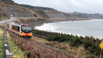 ラッキーなことに五能線を走ってきたのは「リゾート しらかみ号」でした....