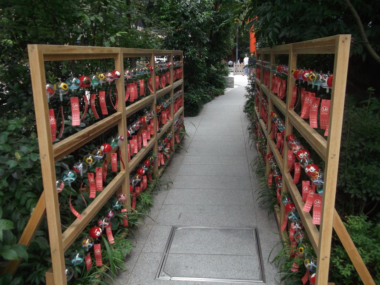 コレド室町などのビルに囲まれた一角にある福徳神社。ここは廻りの喧騒とはかけ離れて、静かで落ち着いた空間が広がっています。ちょうど夏らしいたくさんの風鈴が参道に沿ってかざられていて、暑い夏の季節の中で一服の清涼剤のように美しい音色を響かせていました。