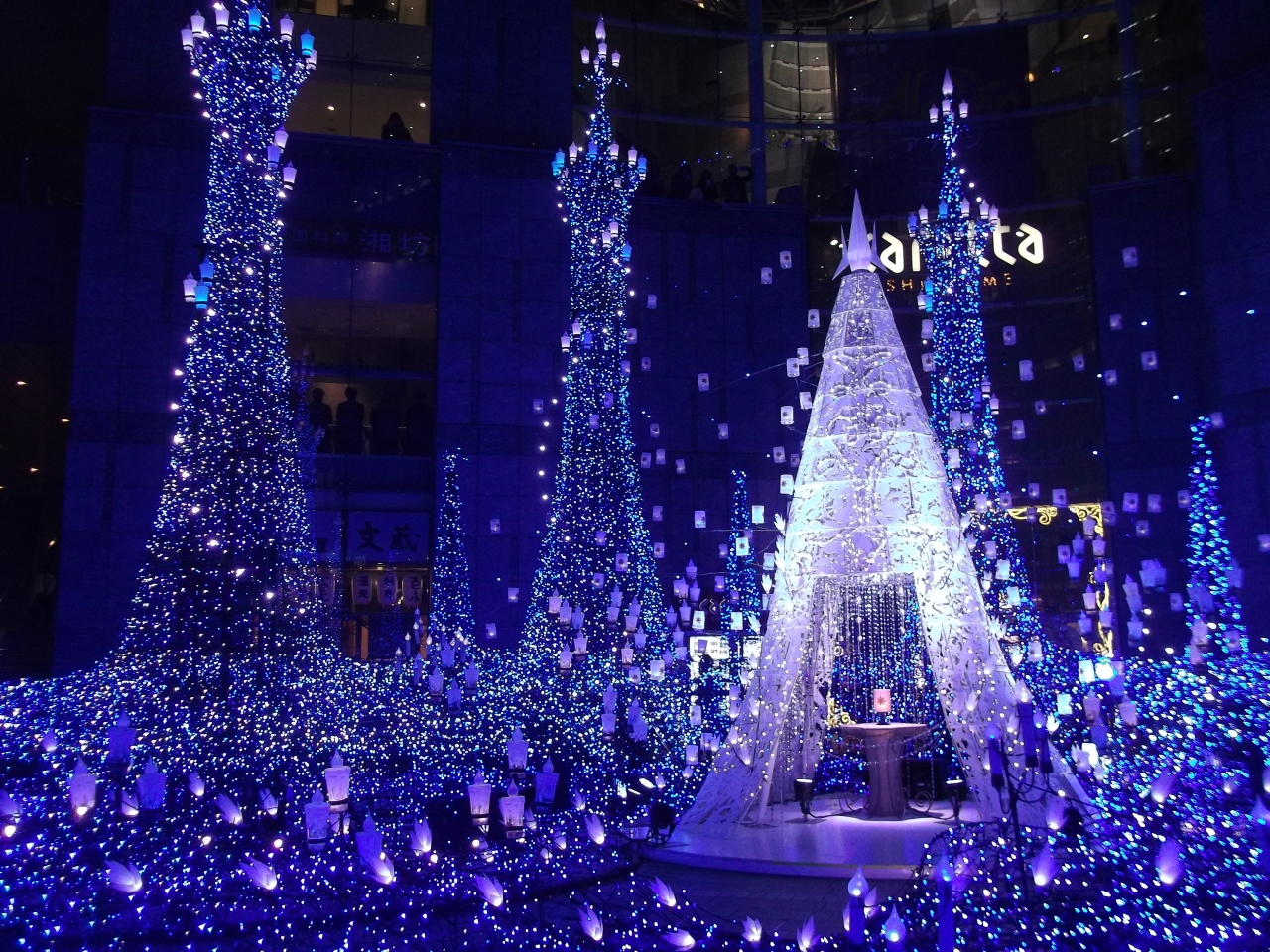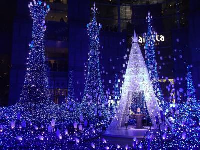 大江戸線汐留駅隣接のカレッタ汐留では、11月に入るとクリスマスイルミネーションが始まります。色とりどりのLED電球が取り付けられた装飾はそれだけでも美しいですが、数分間の音楽を取り混ぜた演出が決まった時間に催され、寒い中でも楽しい気分にさせてくれました。