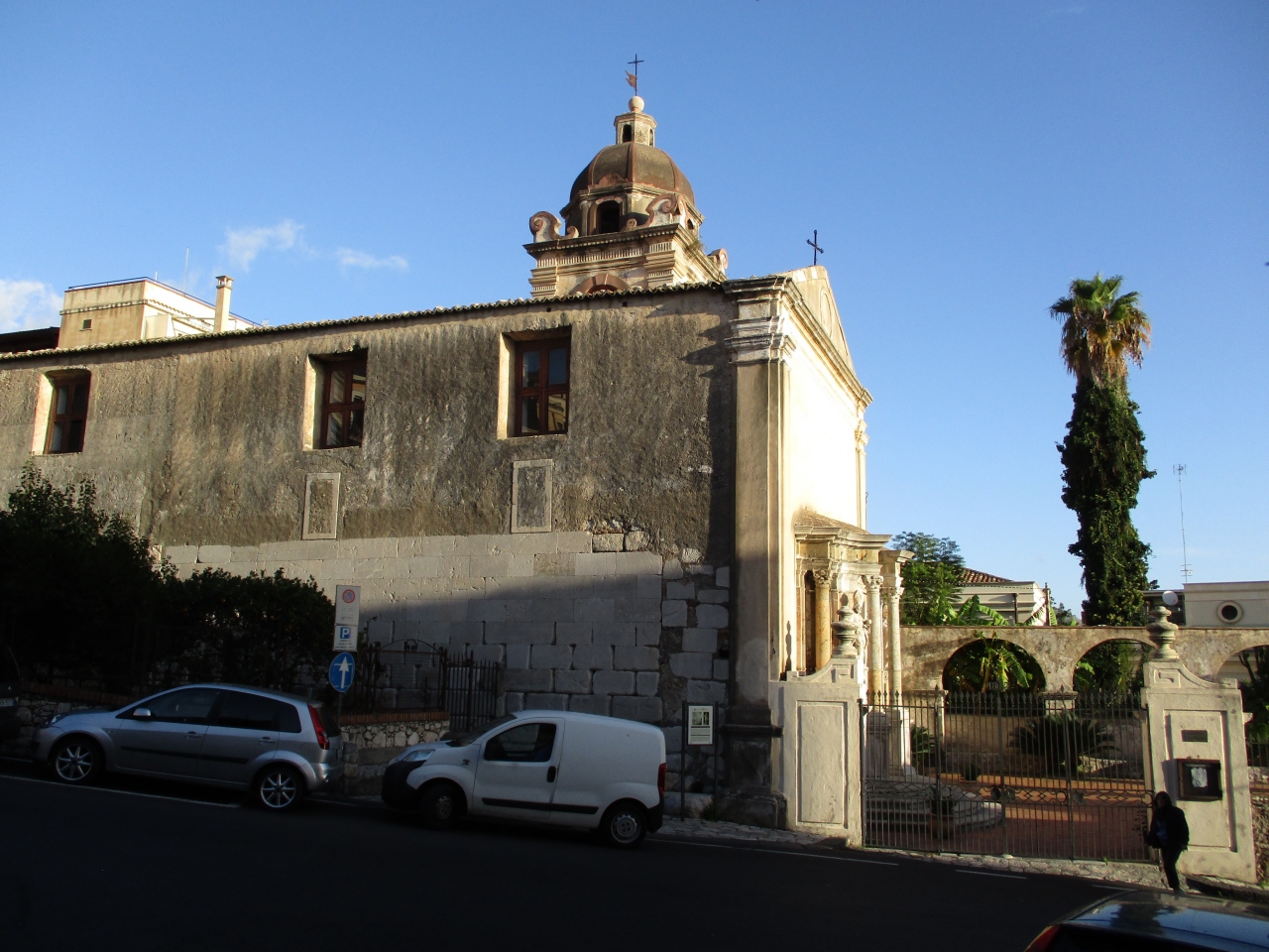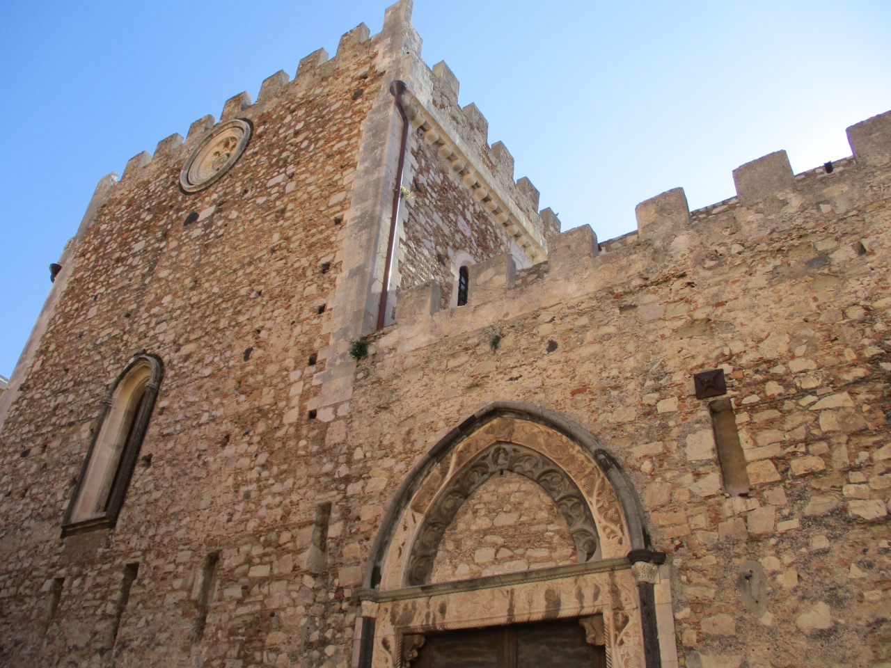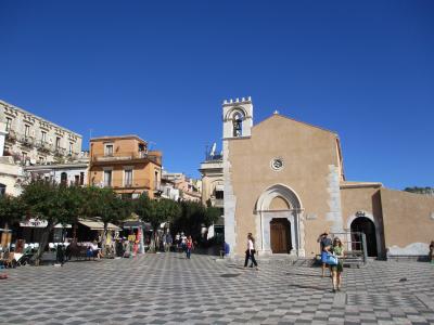 タオルミーナ旧市街の入り口、メッシーナ門に入る少し手前にある教会です。外観を見ると特別にこれという特徴のある教会ではありませんが、建物を横から眺めると比較的大きい教会であることがわかります。このあたりは急な坂が続き歩きづらいところですが、所々で海が眺められ景観を楽しめます。