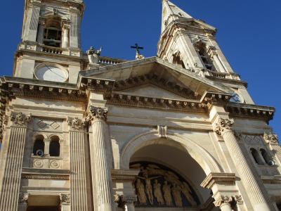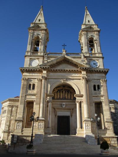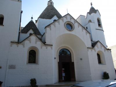 アルベロベッロ旧市街の北の端にある教会です。鐘楼を抱えた二つの塔が空に向かってそびえたつ姿は力強さを感じさせます。正面から見ると石造りの左右対称の外観は芸術的な美しさがあり、その一方で教会らしい重々しさも感じられました。内部も簡素な造りではあるものの、厳かな雰囲気が漂う教会でした。
