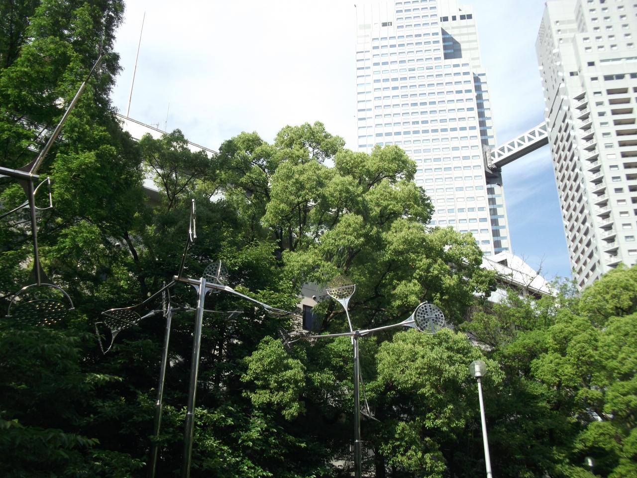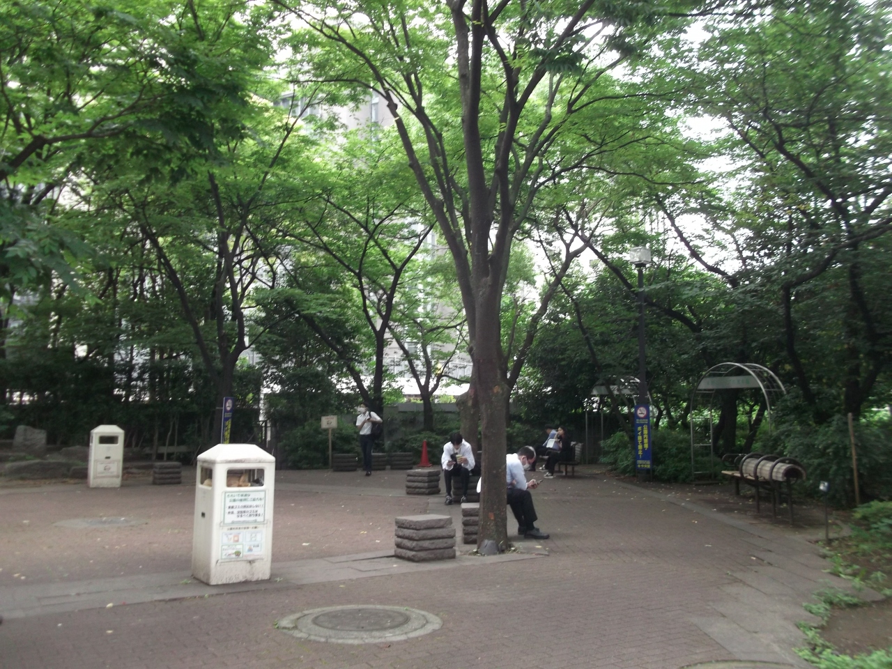 新橋演舞場のすぐ隣にある小さな公園です。まわりをビルに囲まれている中で、この一角だけが緑に覆われて日陰ができ、オフィス街の中の憩いの場所のようになっています。ちょうど昼休みの時間帯で、多くの人がそれぞれの休憩を取っていました。