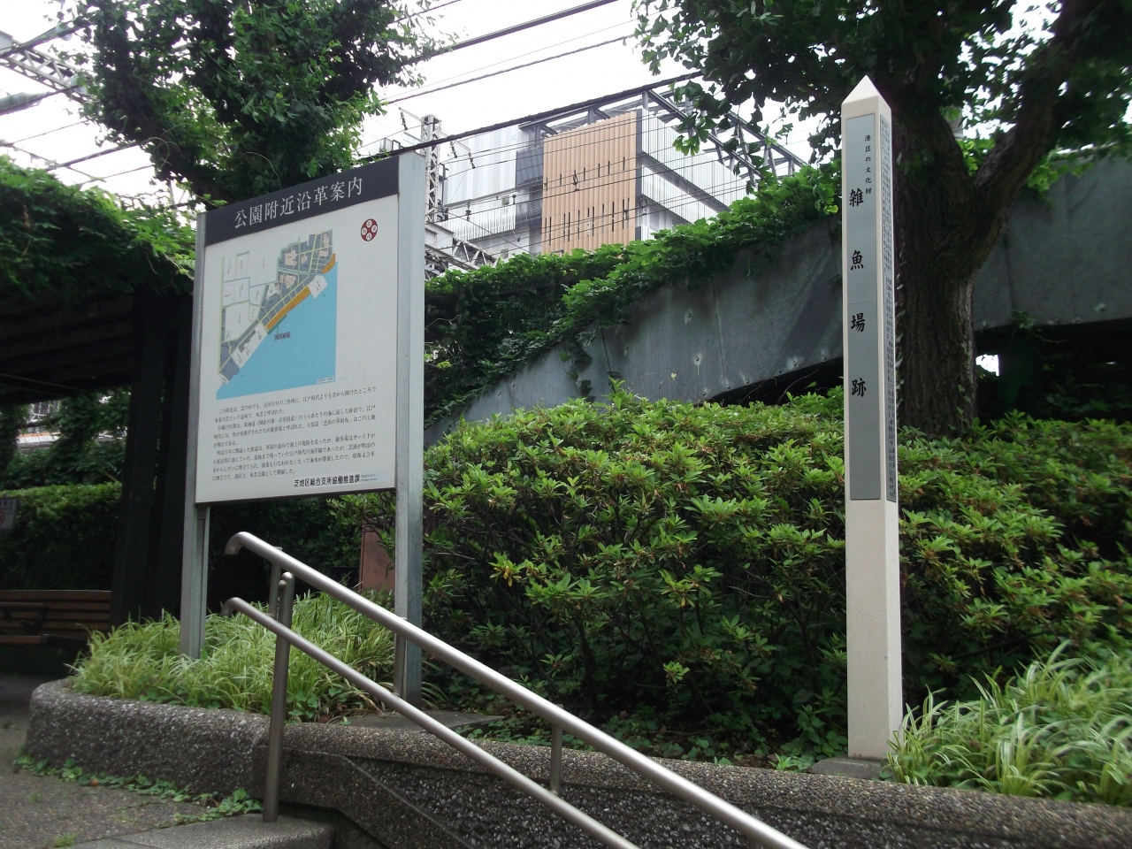地下鉄三田駅から歩いて3分ほど、JRの線路沿いにある本芝公園の一角に雑魚場跡を示すポールが立っていました。このあたりはかつて小さな入り江になっていて、昭和37年まで漁業基地だったそうです。江戸時代にここの漁民が雑魚を商っていたことから雑魚場の名前で呼ばれるようになりました。今はその面影は全くありませんが、案内表示が過去の姿を伝えています。