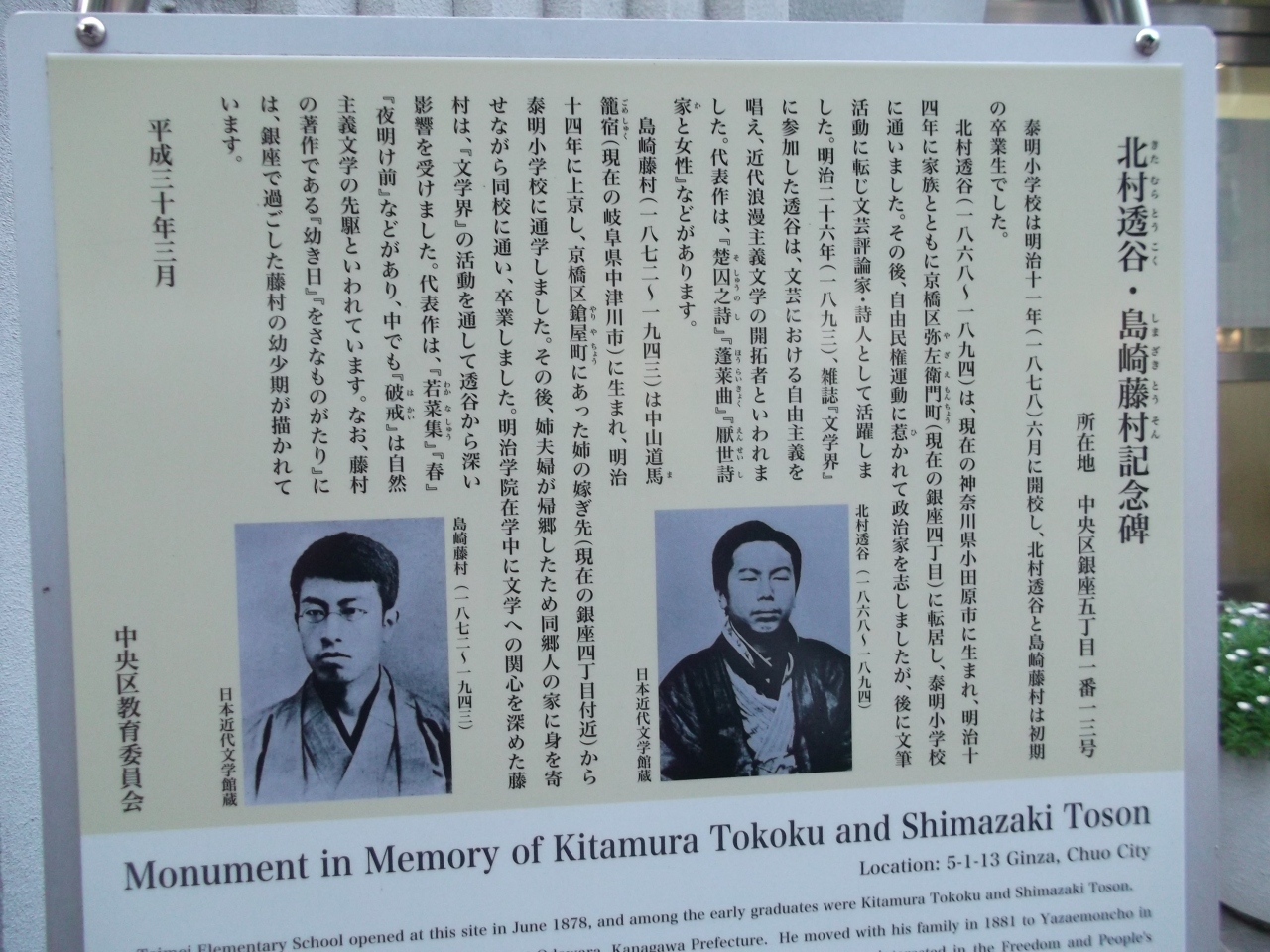 銀座の数寄屋橋からほど近いところにある泰明小学校正門横に、この石碑と説明板が立っていました。二人は年齢は4歳ほど違いますが、明治時代の初めにこの小学校に在校し、卒業したのだそうです。近代文学に深く関わる二人が、同じ学校の卒業生であることは興味深いです。