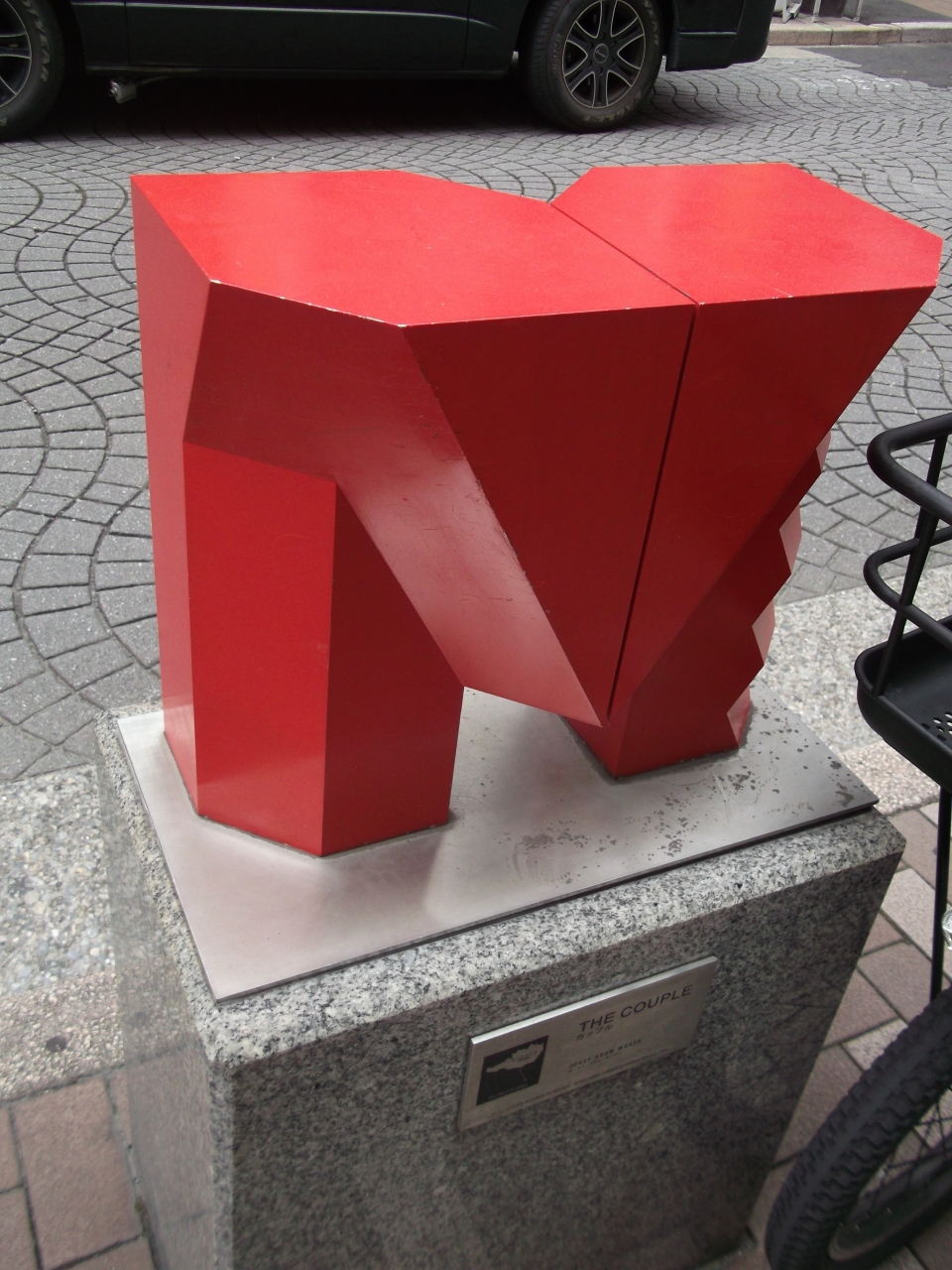 麻布十番大通りの暗闇坂とあひる坂の間あたりにある、麻布十番に点在する微笑みのモニュメントの一つです。オーストリア人の作品で、色鮮やかな赤に塗られたモニュメントはとても目立って見えます。真ん中で二つに割れているので、カップルという名称から男女を表しているのだと思いますが、なかなか理解するのは難しいです。