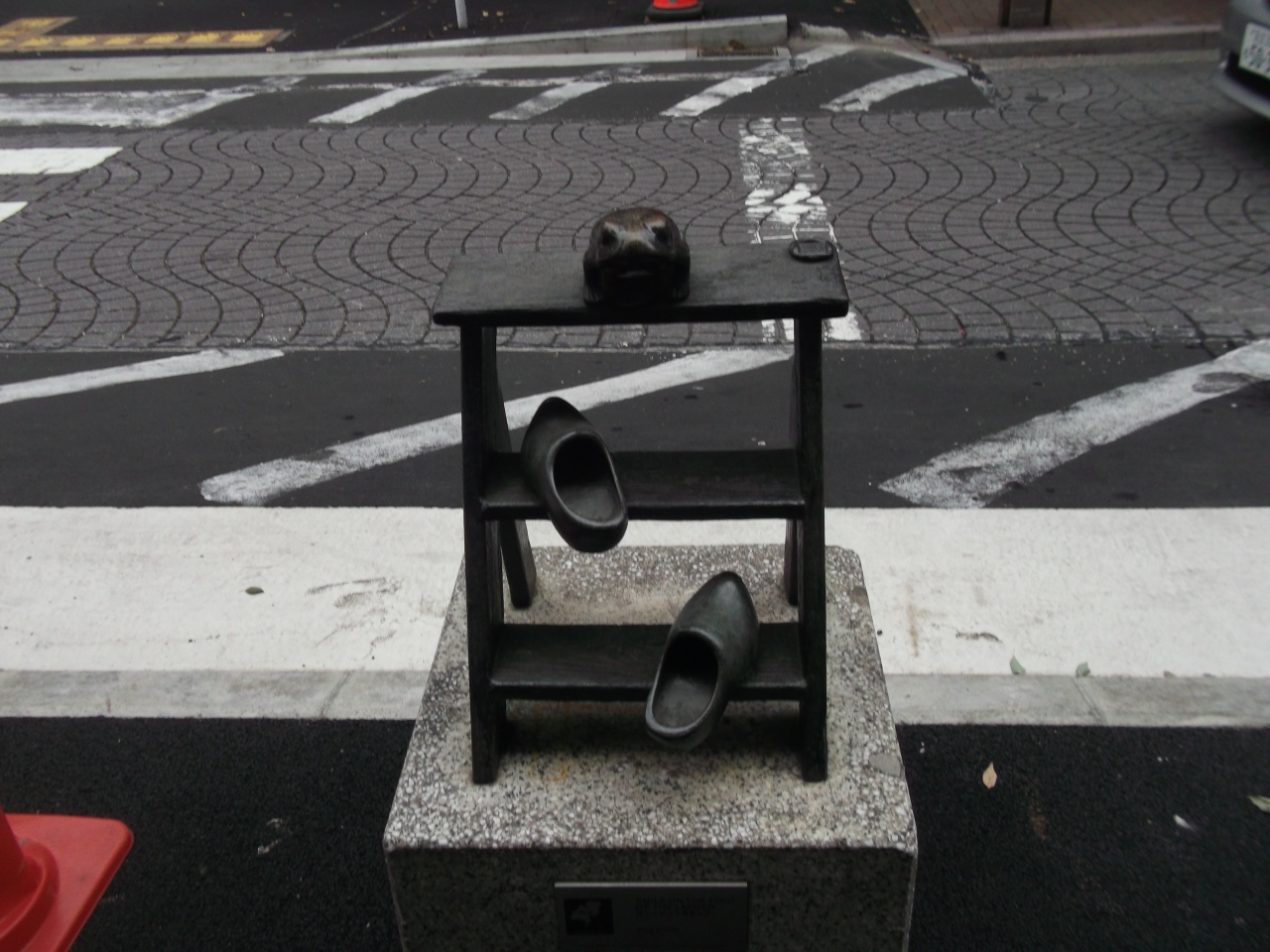 麻布十番大通りと暗闇坂が交わるマニヴィアビル前にある、麻布十番に点在する微笑みのモニュメントの一つです。オランダ人の作品で、階段の上に靴が乗っていて、その向きがいかにも上がっていこうとしているかのように見えます。一番上には、なぜかカエルがこちらを向いてのっかっています。