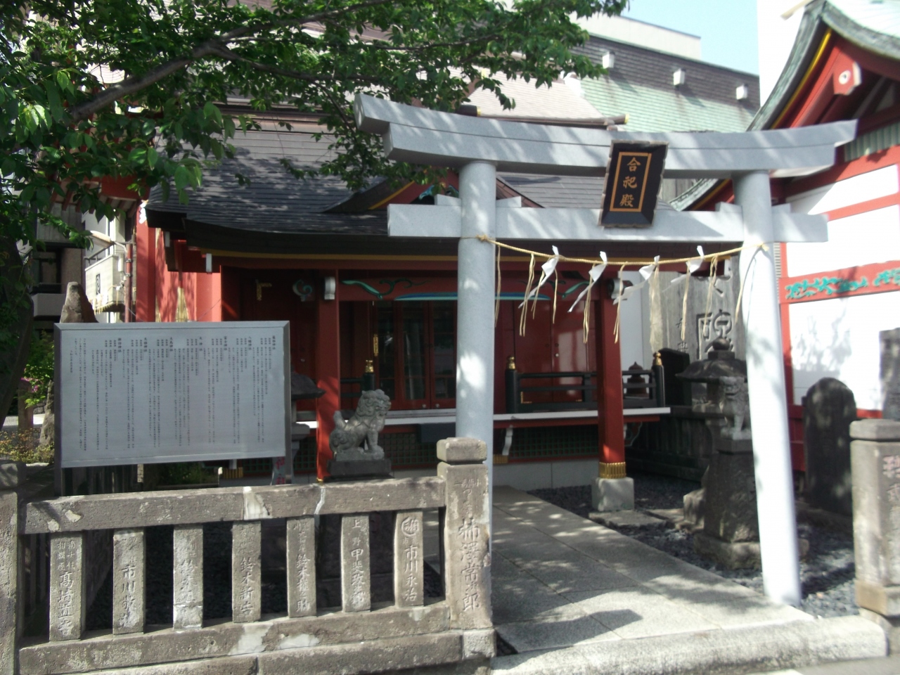 神田明神境内の御神殿の裏手にある、旧・籠祖神社のあった場所に建てられた合祀殿です。籠祖神社のほか、神田明神本殿に合祀されていたいくつかの神社を合祀して平成24年に建てられたものです。白い鳥居とその先に建つ朱色の社殿のコントラストがとても映えて見えます。